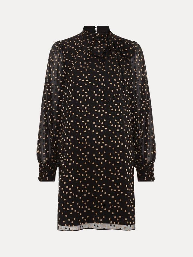 Платье Mabel свободного силуэта на однотонной основе с принтом в горошек и длинными рукавами-блузонами. Высокий круглый вырез дополнен шарфом, создающим идеальное мини-платье для дня или ночи.