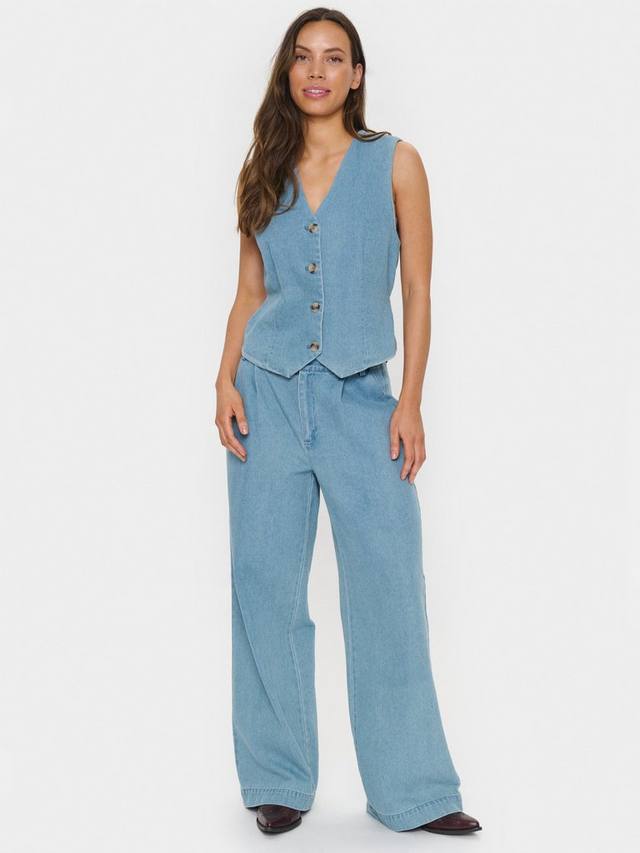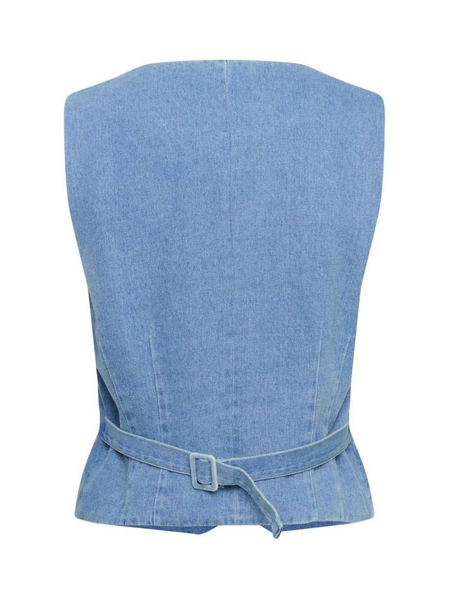 Джинсовый жилет Jaclyn - модный и подчеркивающий фигуру топ с бесконечным выбором фасонов. У него V-образный вырез и пуговицы, а также обычная посадка с поясом с пряжкой сзади для регулировки силуэта. Жилет имеет разрез в верхней части бедер и заостренные уголки спереди.