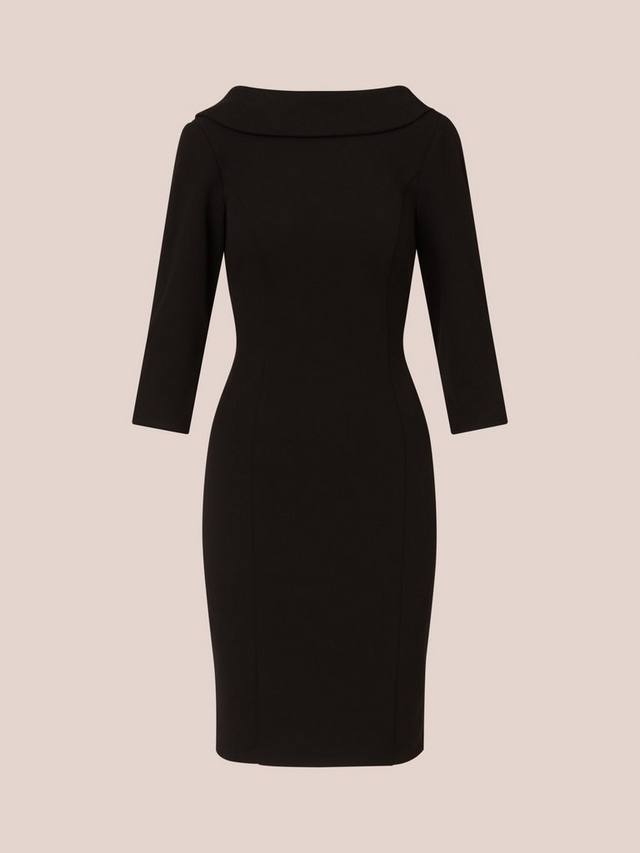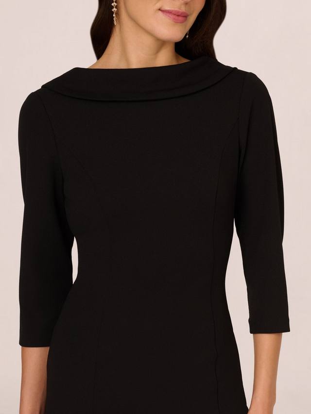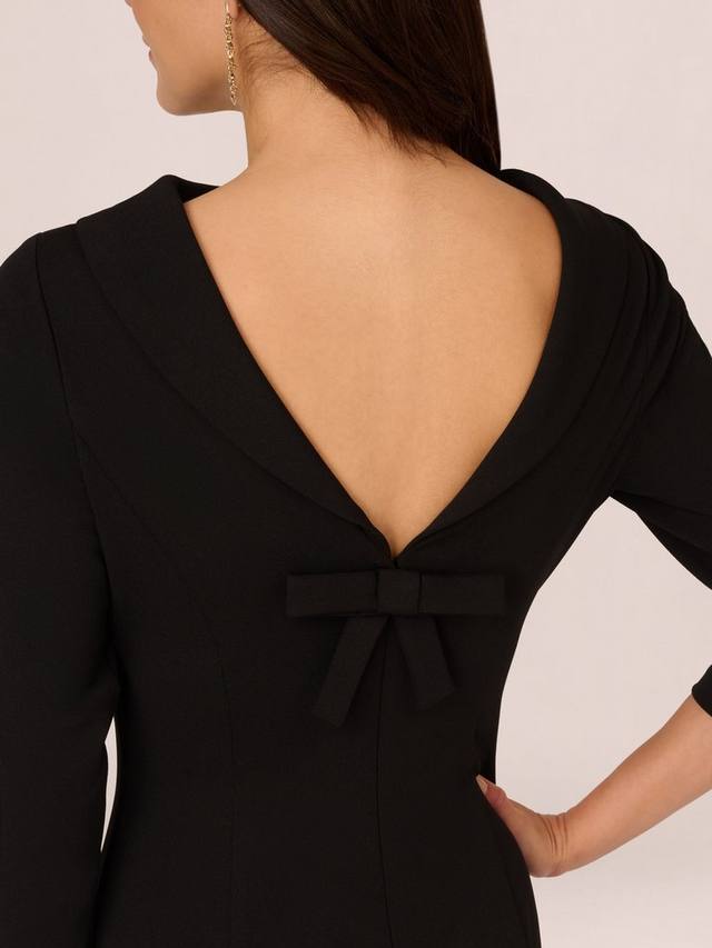 Надев это платье миди с рукавом три четверти, вы окунетесь в свою неподвластную времени эпоху. Вырез лодочкой спереди, дополненный воротником-лентой, плавно переходит в воротник-шаль сзади, создавая эффектный силуэт со всех сторон. Рукава длиной три четверти придают утонченности, а шикарный бант сзади придает женственности этому платью с рукавами длиной три четверти. Это облегающее платье, сшитое из трикотажного крепа, который хорошо тянется, отличается удобством фасона.