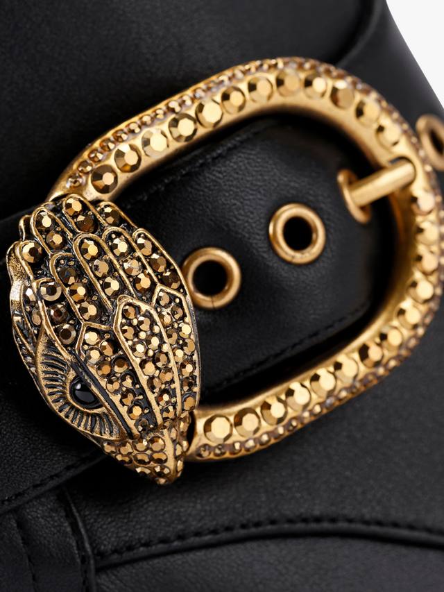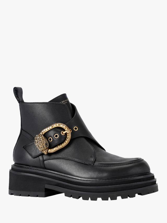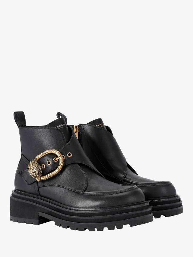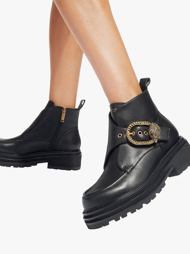 Массивные ботильоны Mayfair от Kurt Geiger London с верхом из черной кожи. Через ногу проходит фирменный ремешок, который застегивается старинной латунной пряжкой с изображением головы орла.