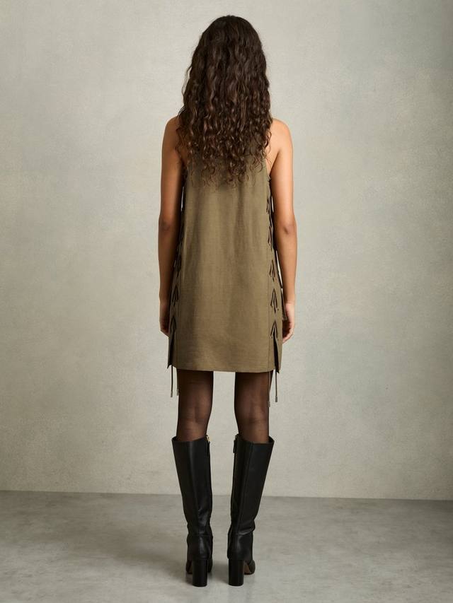 Это практичное мини-платье от Reiss, представляющее собой образец простоты, сшито из мягкого льна. Это платье без рукавов с высоким вырезом позволяет продемонстрировать его универсальность.