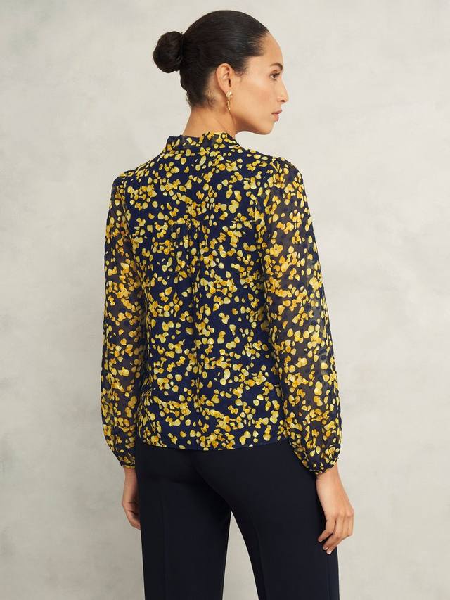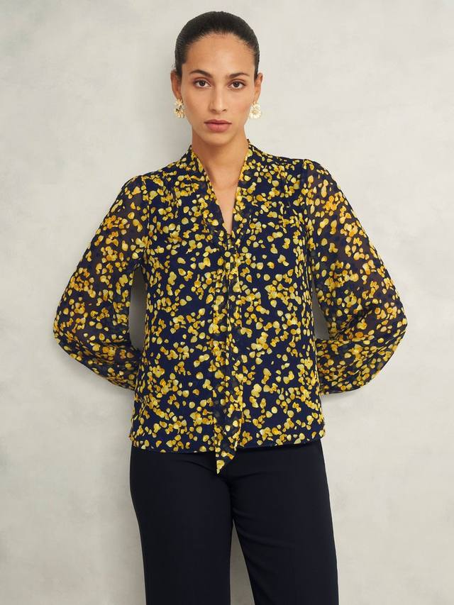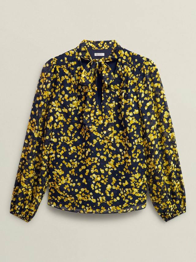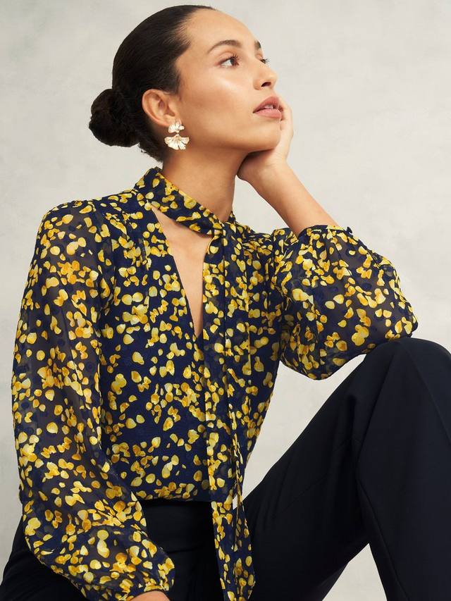 Блузка Aria, представляющая собой идеальное сочетание элегантности и возвышенности, излучает женственность благодаря принту в виде разбросанных лепестков и шикарному вырезу в виде бантика.
