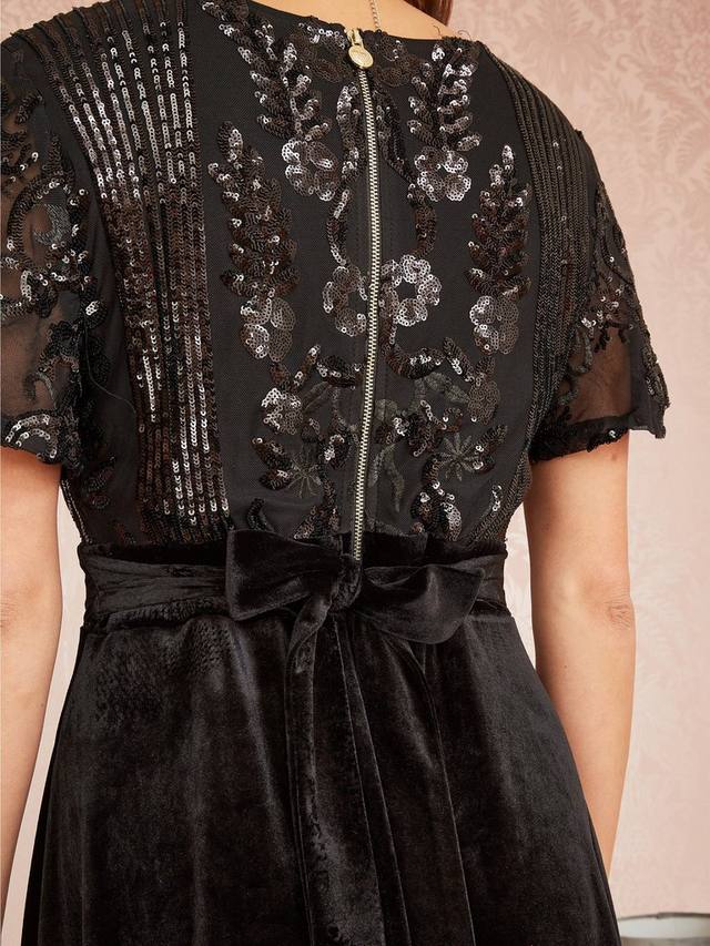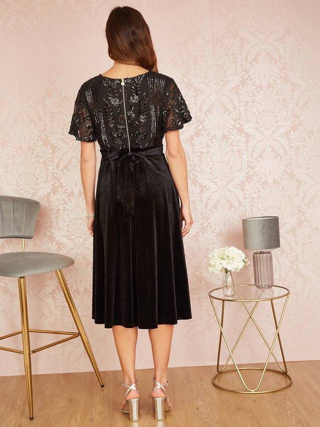 Это новая волна изысканных блесток для вечерних нарядов в этом сезоне. Это платье от Yumi подарит вам ощущение роскоши на миллион долларов с того момента, как вы его наденете. Расклешенная бархатная юбка миди длины с глубоким V-образным вырезом, завязкой на талии и лифом, украшенным блестками, очень идет фигуре. В целом, мы знаем, что это идеальный способ выделиться на вашей рождественской вечеринке, сочетая простые аксессуары и излучая элегантность.