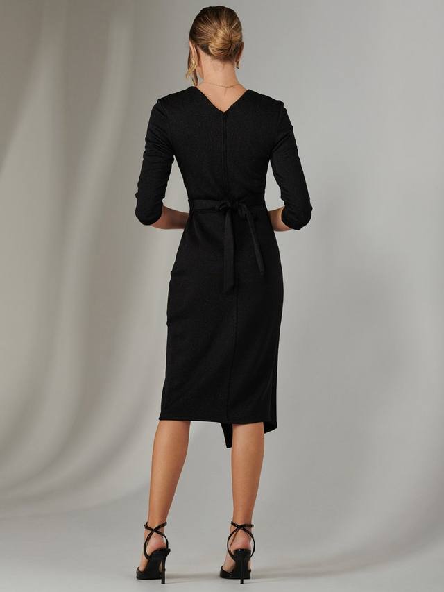 Завораживающее платье-футляр с металлическим обручем, переливающееся ослепительным блеском, идеально подходит для вечерних мероприятий или особых случаев. Это платье с приталенным V-образным вырезом, элегантными половинчатыми рукавами и завязывающимся поясом, подчеркивающим вашу талию, создает изящный силуэт, подчеркивающий изгибы. Застегивающийся на незаметную молнию сзади, он сочетает в себе элегантность и очарование в одном незабываемом образе.