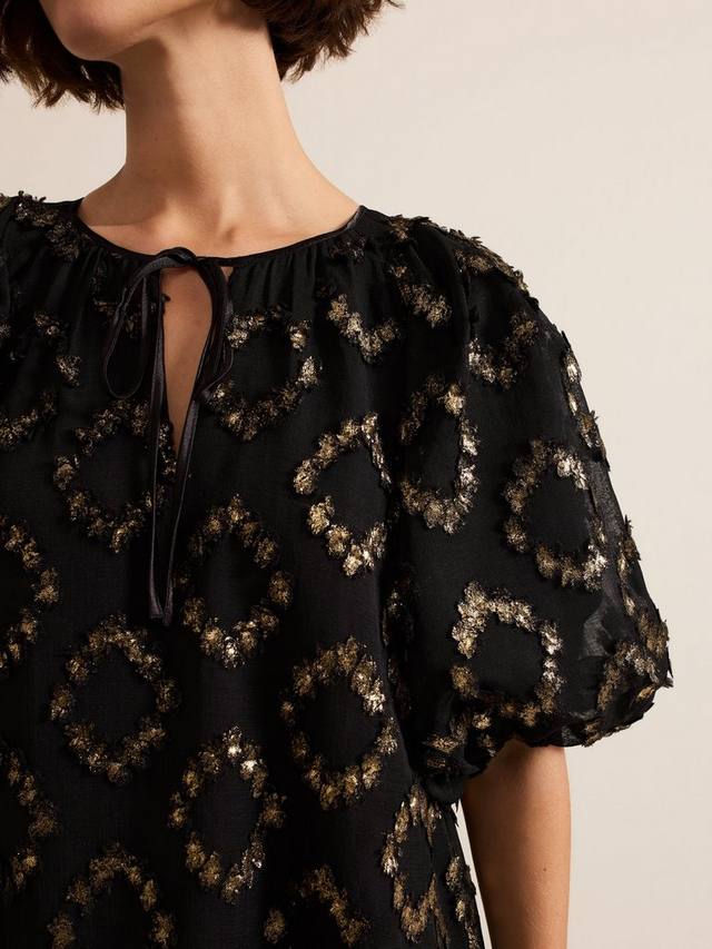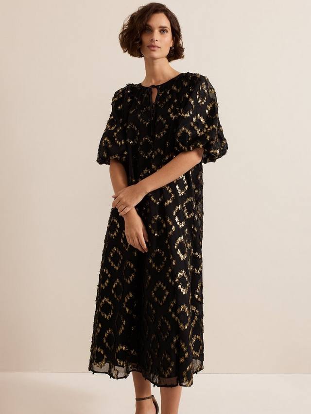 Познакомьтесь с новым героем. Это новое дополнение к столь любимому платью Bella с металлическим ромбовидным принтом. Благодаря большим пышным рукавам и замочной скважине, оно имеет привлекательную трапециевидную форму и ниспадает до длины миди, обеспечивая плавное движение, что идеально подойдет для вашего следующего особого случая. Изготовлено с использованием переработанных материалов, что помогает нам уменьшить наше воздействие на планету.