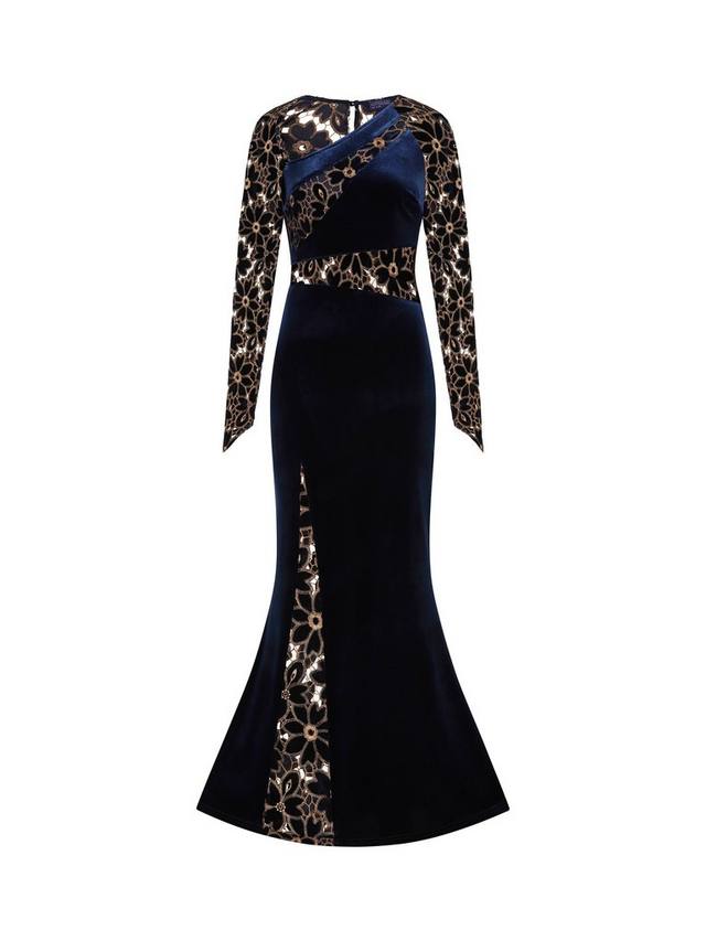 Эффектное бархатное платье от HotSquash. Это платье длиной до пола произведет впечатление в этом сезоне для вечеринок благодаря эффектному асимметричному вырезу и прозрачному бархату с вышивкой, повторяющейся на поясе и разрезе до бедер. Асимметричный вырез добавляет очарования этому платью, а также единственный рукав, который ниспадает на руку в виде точки. Если вы хотите выйти в свет в этом сезоне, это платье определенно заслуживает внимания.