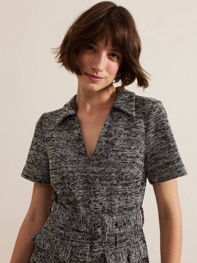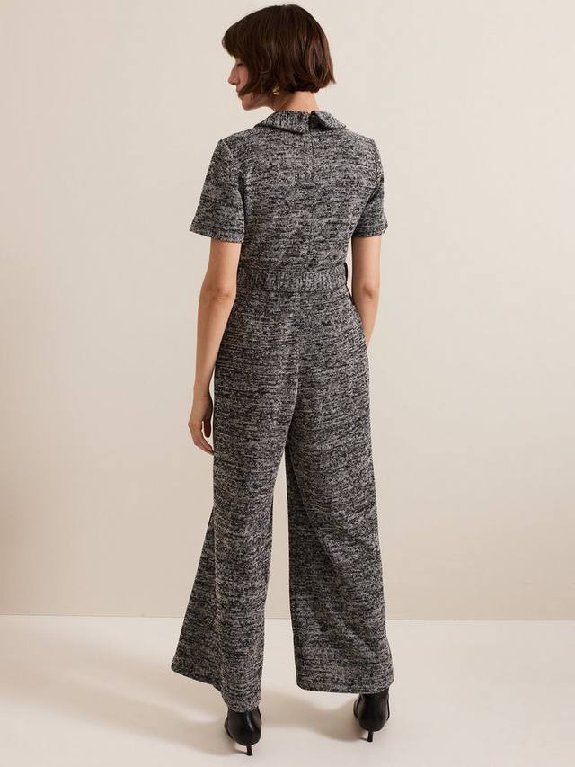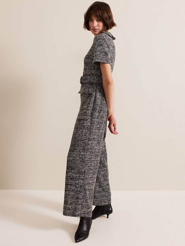 Комбинезон Lavinia от Phase Eight из смесового серого твида с V-образным вырезом и короткими рукавами ниспадает на широкие штанины. Дополнительные детали, такие как передние карманы с клапанами и облегающий пояс в тон, подчеркивают стиль современной рабочей одежды.