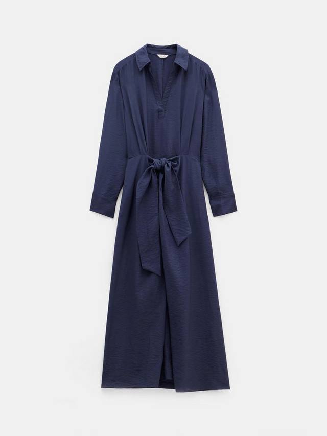 Для каждой коллекции необходимо межсезонное платье. В качестве примера можно привести это платье миди от HUSH из мягкой вискозы с воротником, рукавами полной длины и завязкой спереди.