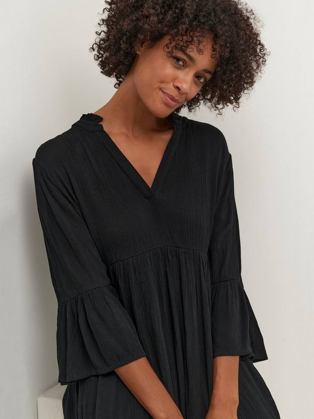 Это многоуровневое платье длиной до колен от KAFFE, создающее эффектный штрих, сшито из воздушной вискозной ткани. Этот фасон без излишеств, но с элегантным v-образным вырезом и рукавами длиной три четверти обязательно станет ключевым дополнением к вашему образу.