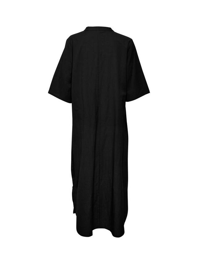 Платье Kaisey повседневного и удобного фасона из мягкой и легкой смеси хлопка и льна. У него V-образный вырез с воротником-резинкой и свободный крой с широкими плечами. Платье с прямыми рукавами длиной до середины икр, с разрезом ниже икр и закругленным подолом.