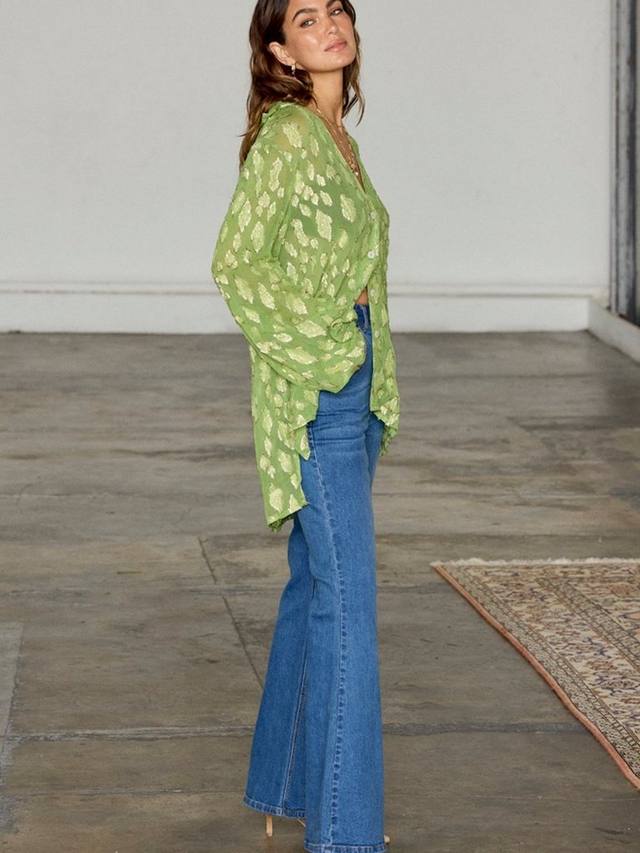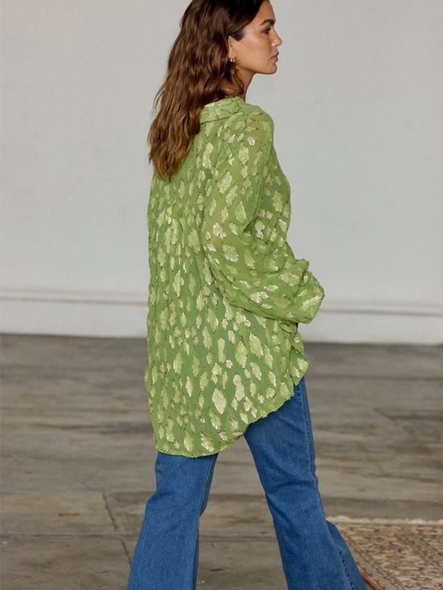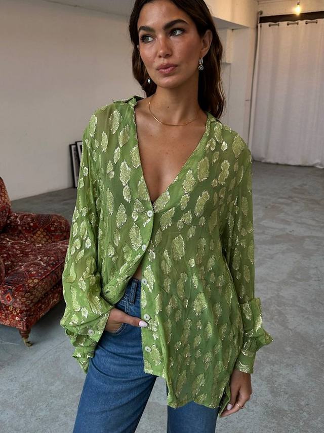 Эта рубашка от Never Fully Dressed, выполненная из жаккарда с металлическим флокированным принтом, имеет v-образный вырез, объемные рукава длиной три четверти и высокий-низкий низ.