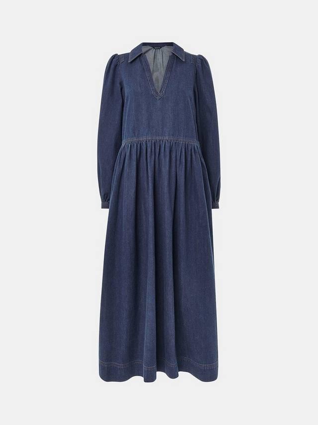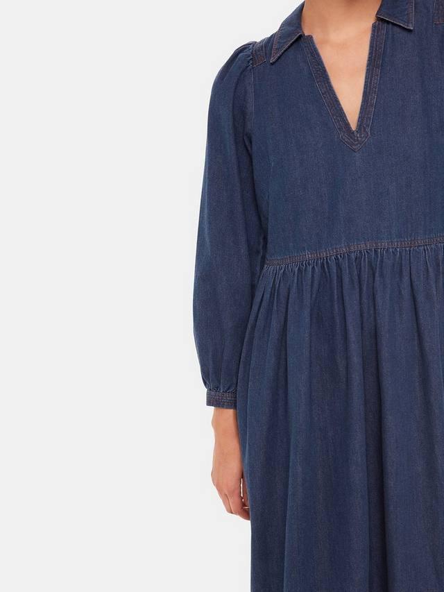 Это платье миди от Whistles, подчеркивающее комфорт трапециевидного силуэта, выполнено из легкой хлопково-джинсовой ткани. Этот стиль с универсальным v-образным вырезом, выразительным воротником и рукавами полной длины олицетворяет собой торжество минимализма.