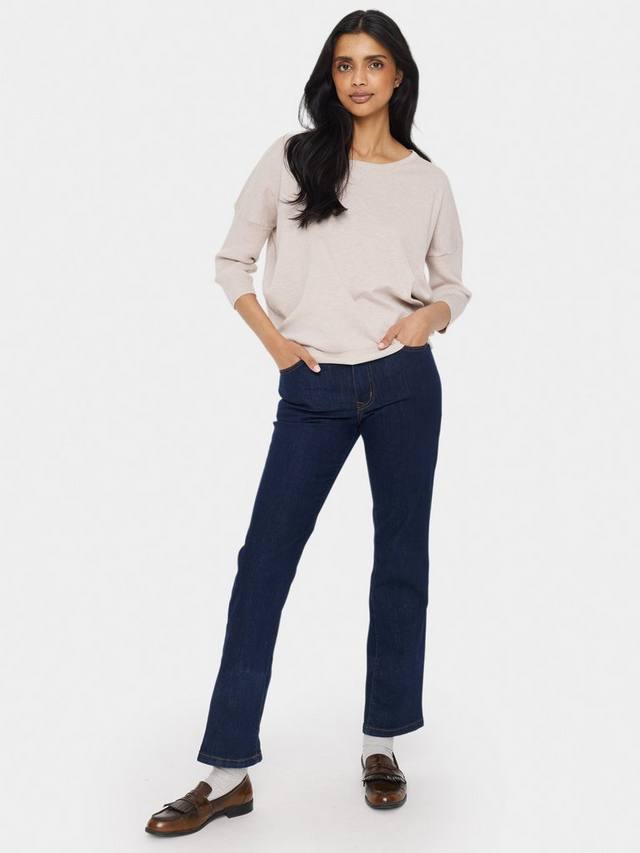 Пуловер Mila - это повседневный и удобный топ на каждый день с круглым вырезом. Он имеет рукава "летучая мышь" длиной 3/4, выполненные из трикотажного ребристого полотна. Пуловер имеет зауженный низ, а низ и рукава "летучая мышь" придают ему свободную посадку.