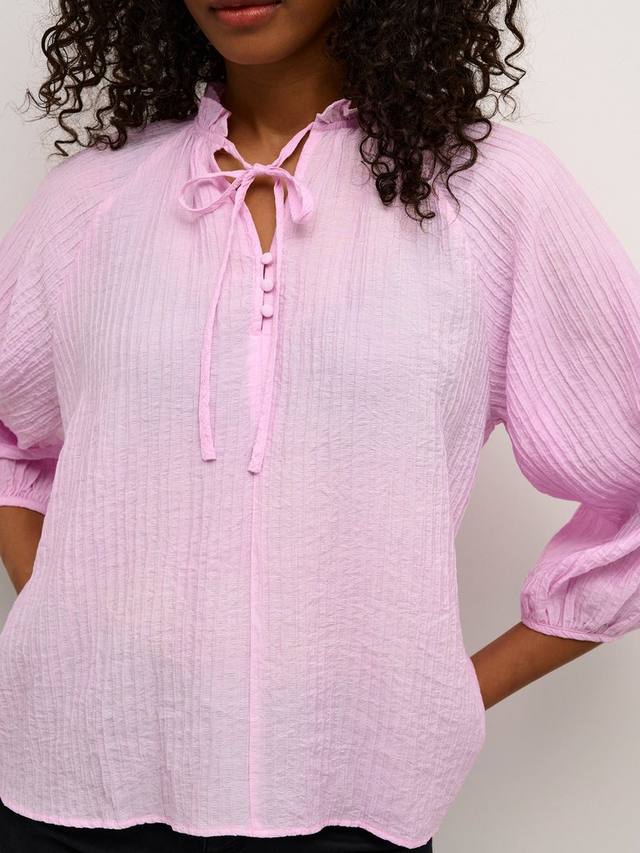 Эта блузка от KAFFE, сделанная без особых усилий, освежит ваш гардероб, в котором он нуждается. Модель с V-образным вырезом горловины хенли, воротником-оборкой, пуговицами и застежкой на галстук, правильной посадки и объемными рукавами с эластичными манжетами.