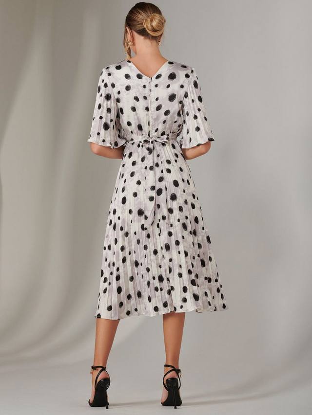 Продемонстрируйте свой стиль в плиссированном платье в горошек, где изысканность сочетается с комфортом. Благодаря струящимся плиссированным рукавам-половинкам и облегающему V-образному вырезу это платье легко облегает вашу фигуру, подчеркивая изгибы. Эластичный пояс растягивается, создавая идеальную посадку, а плиссированная юбка грациозно колышется при каждом шаге. Сзади застегивается на молнию и пояс на резинке.
