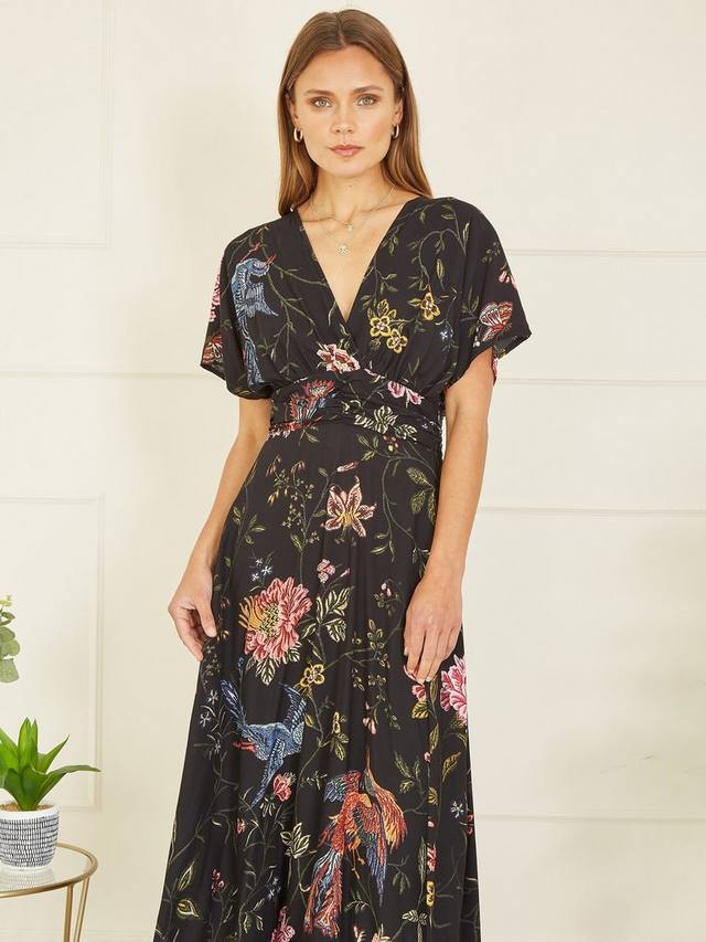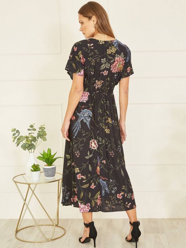 Это миди-платье от Yumi, подчеркивающее фигуру А-силуэта, сшито из жидкой вискозы. Универсально облегающий v-образный вырез и короткие рукава украшены пышным цветочным принтом.