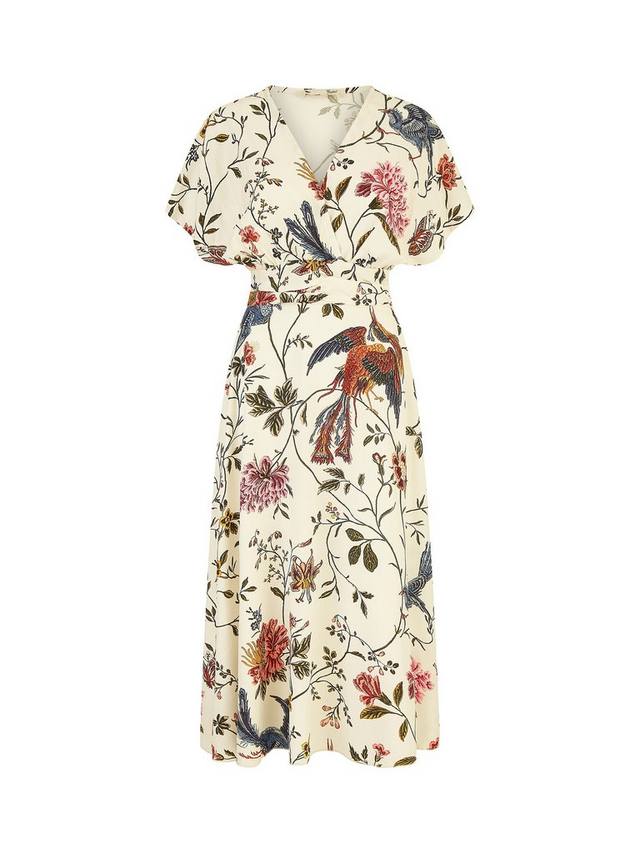 Платье миди-кимоно с птицами и цветочным рисунком Yumi, белый