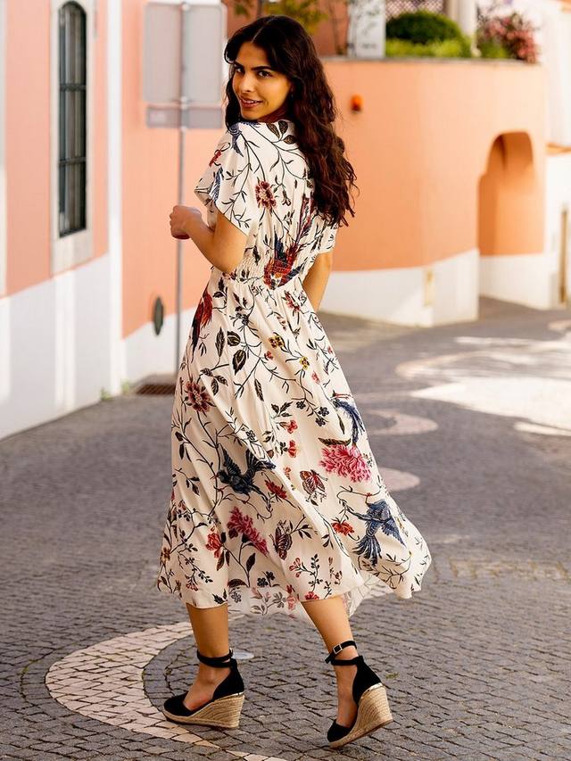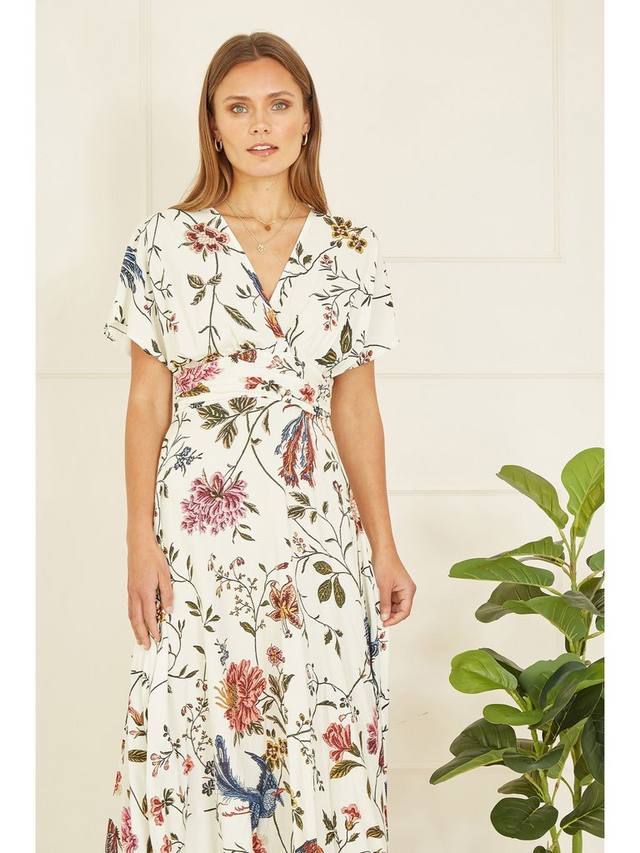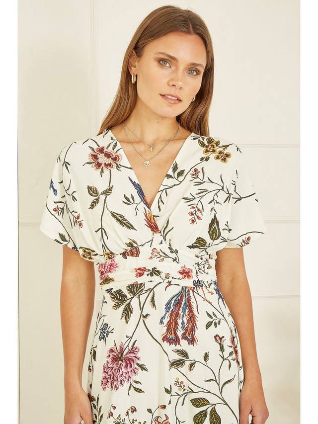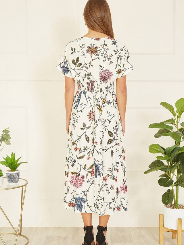 Это миди-платье от Yumi, подчеркивающее фигуру А-силуэта, сшито из жидкой вискозы. Универсально облегающий v-образный вырез и короткие рукава украшены пышным цветочным принтом.