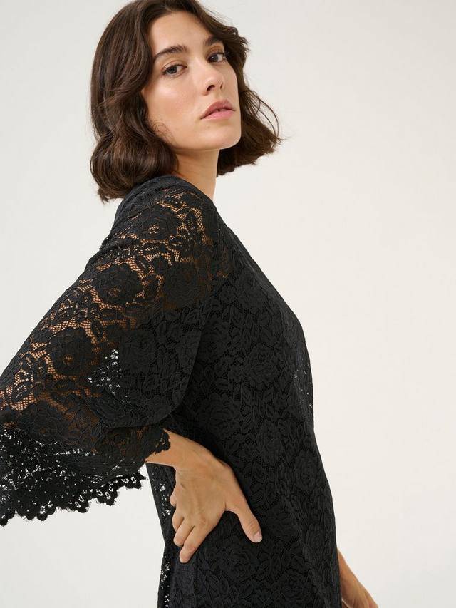 Это платье в пол от KAFFE, легкое в носке, трапециевидной формы с полупрозрачным кружевным верхом, идеально подходит для торжественных случаев. Округлый вырез и рукава длиной три четверти дополнены минимальными аксессуарами, чтобы платье по-настоящему сияло.