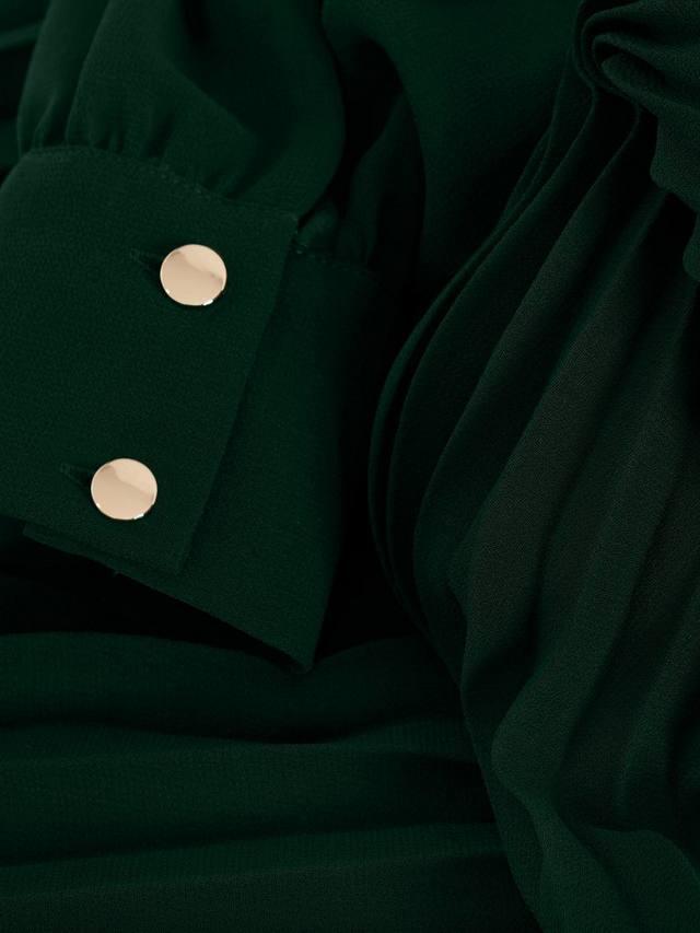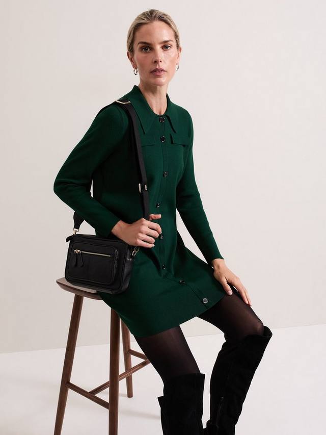 Идеальное платье для дополнения вашего осеннего гардероба. Выполненное в темно-зеленом оттенке платье Azealia с классическим воротником, контрастными пуговицами серого цвета и длинными рукавами создает эффектное трикотажное мини, привлекательное вне времени.