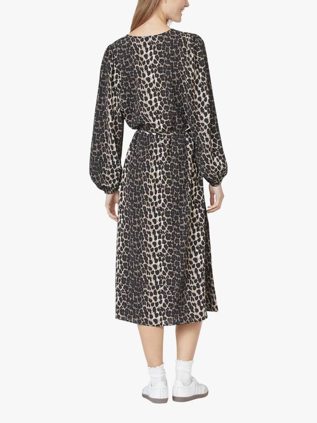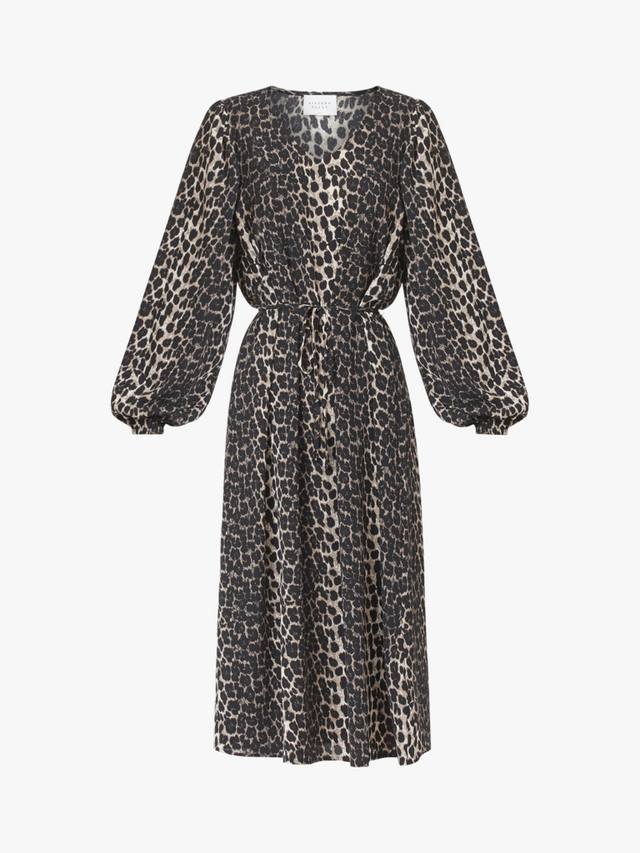 Ventia - длинное платье с леопардовым принтом. Платье свободного кроя с лентой на талии. Платье с v-образным вырезом и пышными рукавами длиной три четверти с резинкой по низу.