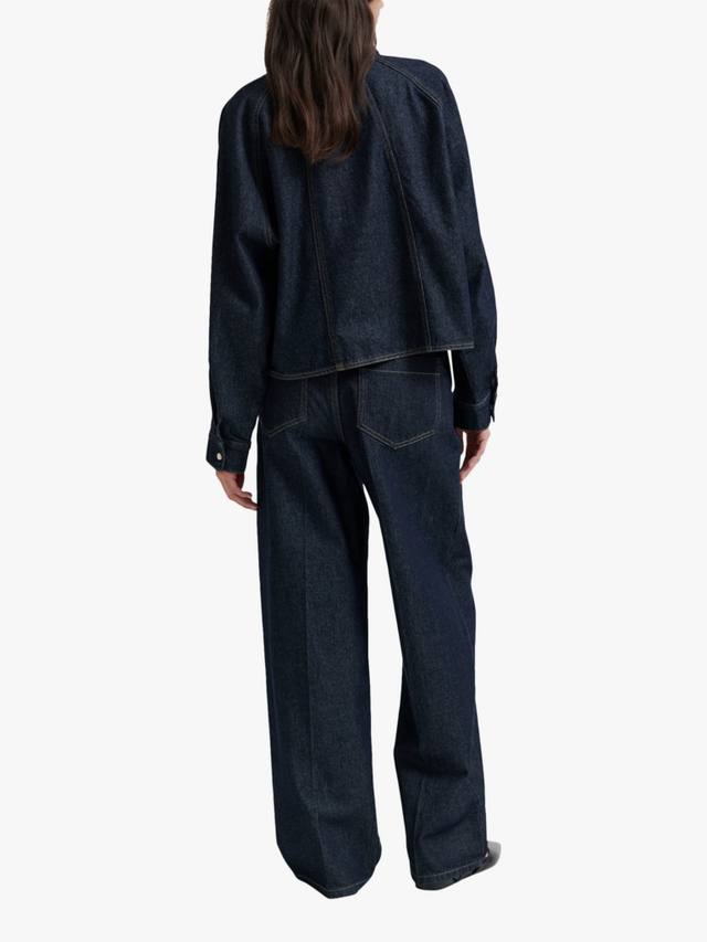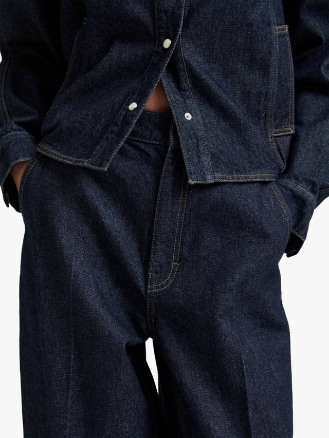 Выполнено из плотного хлопкового денима с контрастной строчкой. Потайная застежка на молнию и пуговицу на талии. Два косых кармана спереди и два кармана сзади. На штанинах складки. Блестящая серебристая фурнитура. Талия средней высоты, ноги широкие, прямые.