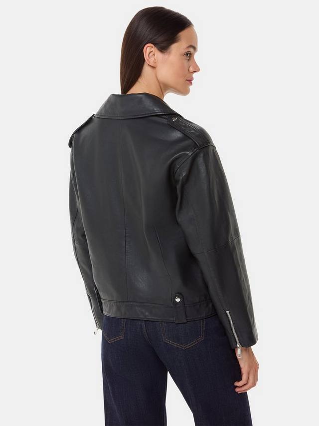 Эта байкерская куртка свободного покроя от Whistles, сшитая из чистой кожи, которая прекрасно стареет при любой носке, облегает бедра и застегивается на серебристую молнию.