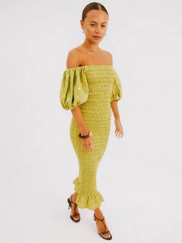 Гофрированное макси-платье облегающего силуэта с волнистым подолом с оборками от Never Fully Dressed выполнено из мягкой хлопчатобумажной смеси. Этот фасон с вырезом с открытыми плечами и короткими пышными рукавами украшен металлическим принтом в горошек.