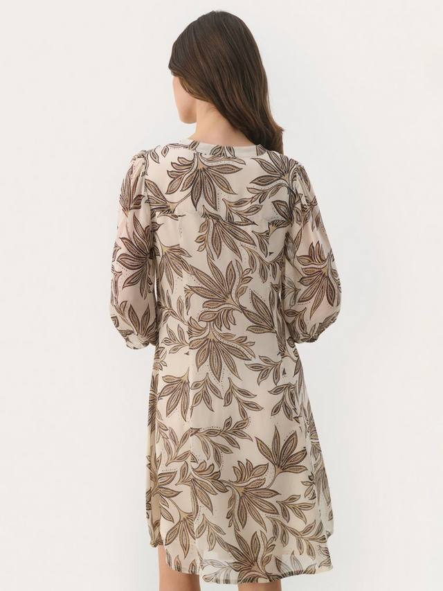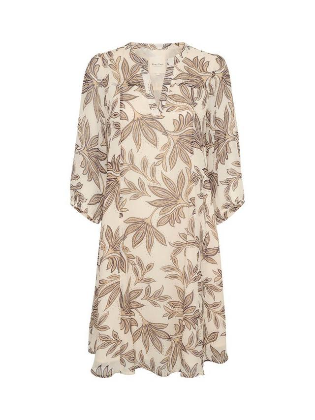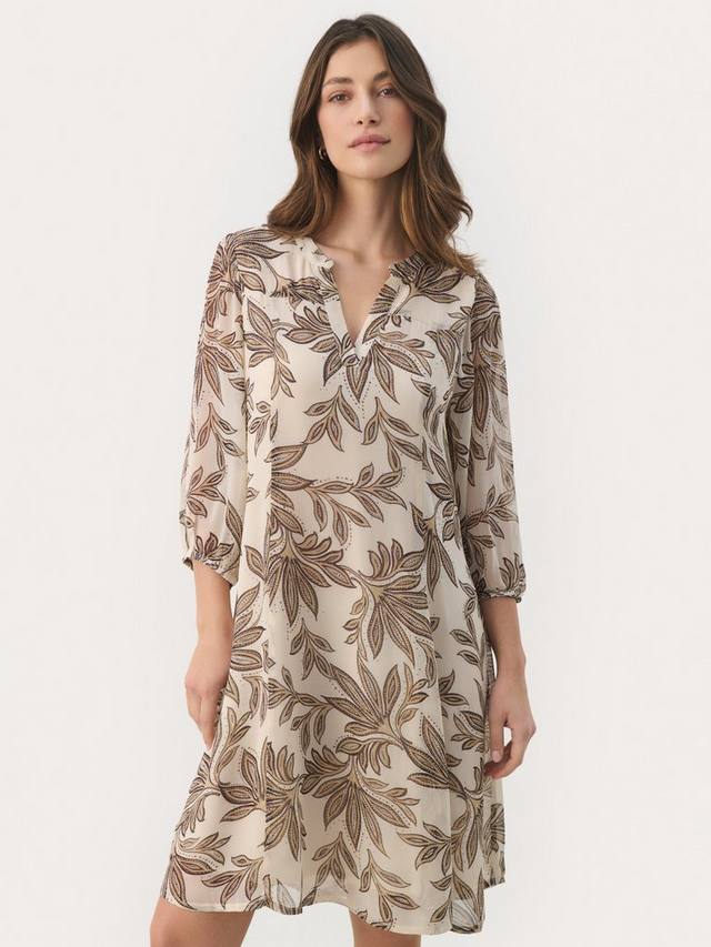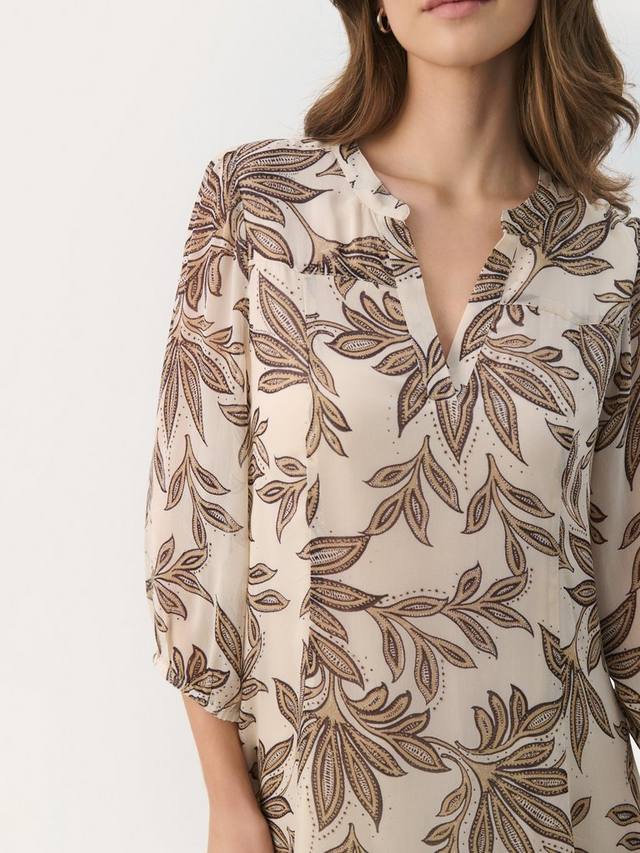 Это платье длиной до колен из второй части с четкими и простыми линиями выполнено из легкой, как шелк, вискозы. Непринужденный v-образный вырез и рукава длиной три четверти выгодно подчеркивают фигуру, а также украшены растительным принтом в виде листьев.