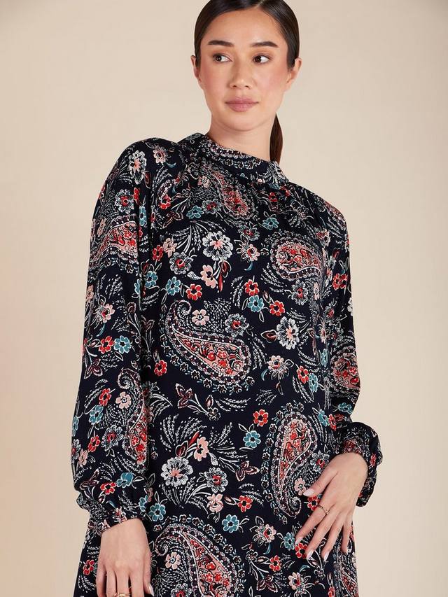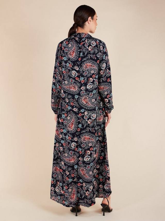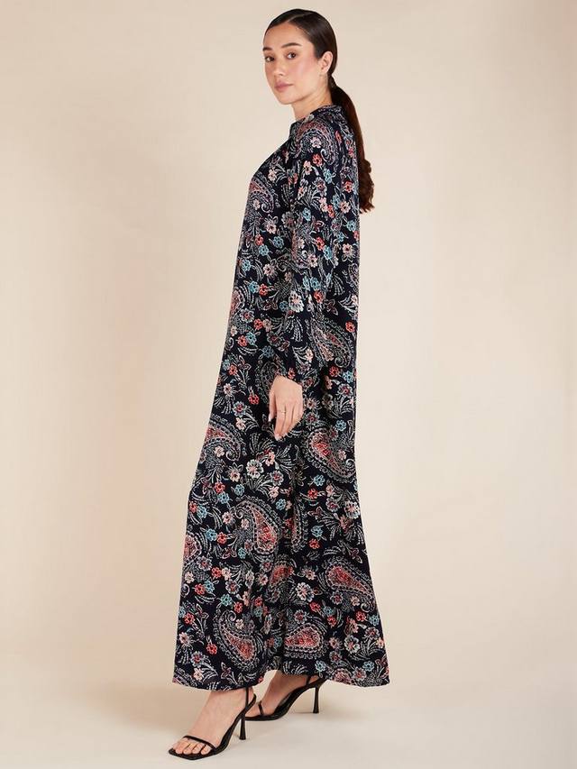 Это платье макси из слегка текстурированного материала с ярким рисунком в виде пейсли. Вырез слегка приподнят и сзади застегивается на молнию. Оно также включает в себя незаметные боковые карманы и дополнительный пояс для дополнительных вариантов укладки.