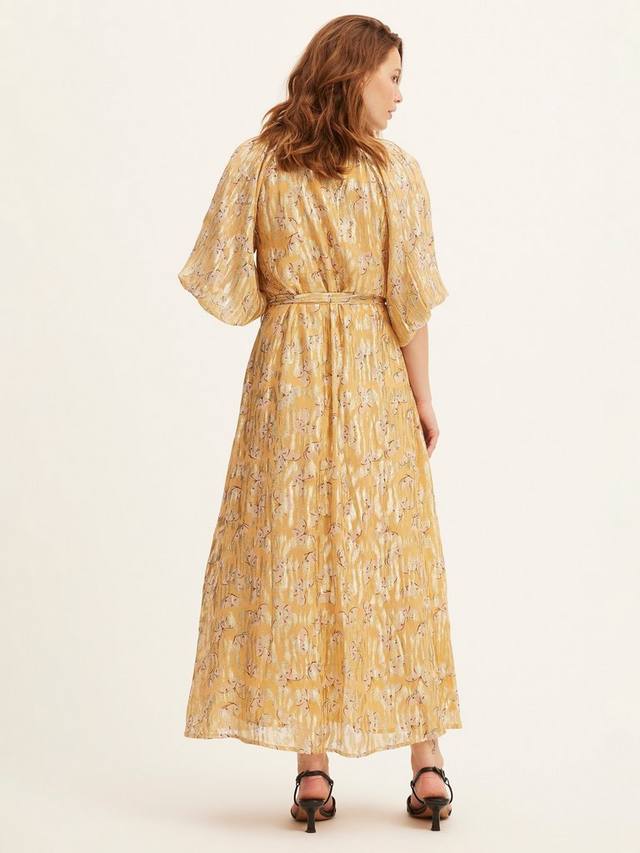 Платье Noor на пуговицах с V-образным вырезом и пуговицами спереди и большими пышными рукавами 3/4 с резинкой на манжетах. В комплекте идет пояс для завязывания на талии.