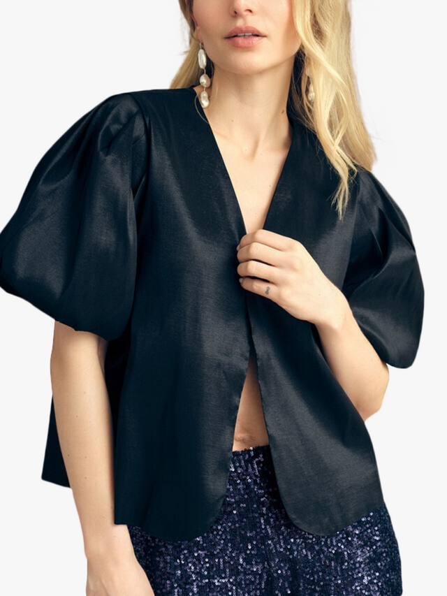 Christa jacket - это короткий жакет с короткими рукавами из блестящей ткани. Жакет имеет V-образный вырез, два больших рукава-баллона и застегивается на две пуговицы.