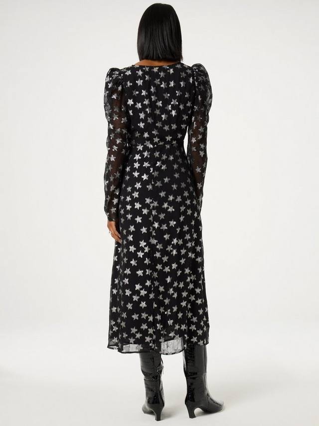 Платье миди с принтом в виде металлической звезды по всему телу. Оно имеет длинный рукав с пышными плечами и эффектный глубокий V-образный вырез со сборкой по центру.