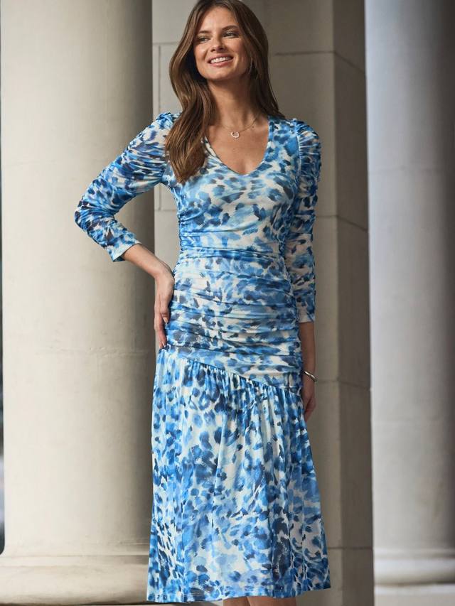 Привлекающее внимание к красоте ваших естественных форм, это платье миди с рюшами от Sosandar изготовлено из сетчатой смеси тканей. Непринужденный v-образный вырез и рукава длиной три четверти подчеркивают фигуру благодаря яркому леопардовому принту.