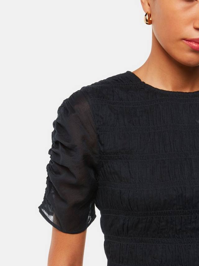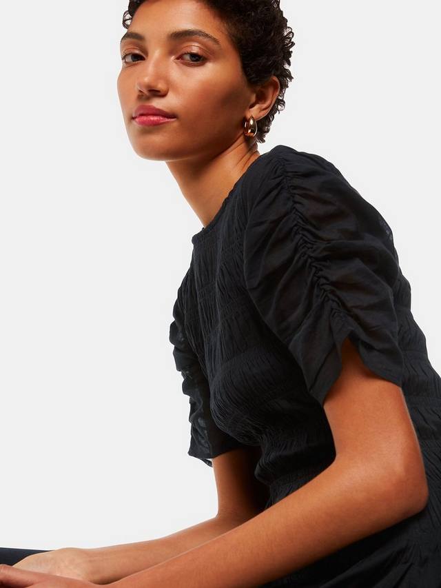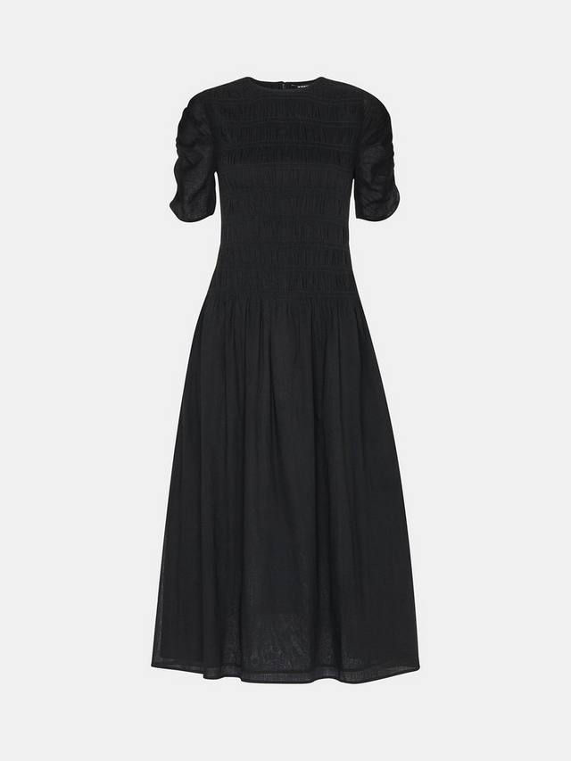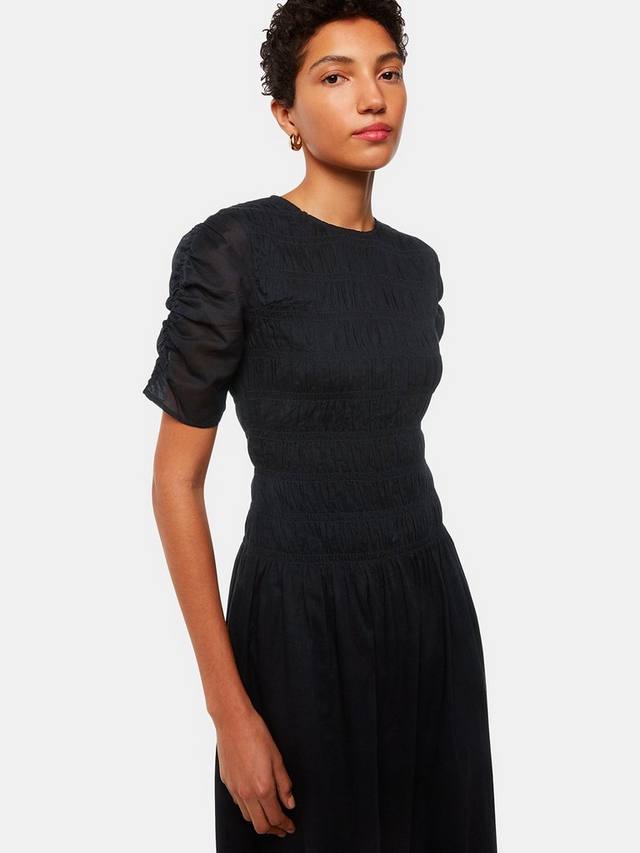 Это платье миди от Whistles, ставшее настоящим фаворитом, выполнено из чистого хлопка. С простым круглым вырезом и короткими рукавами, украшено абстрактным принтом.