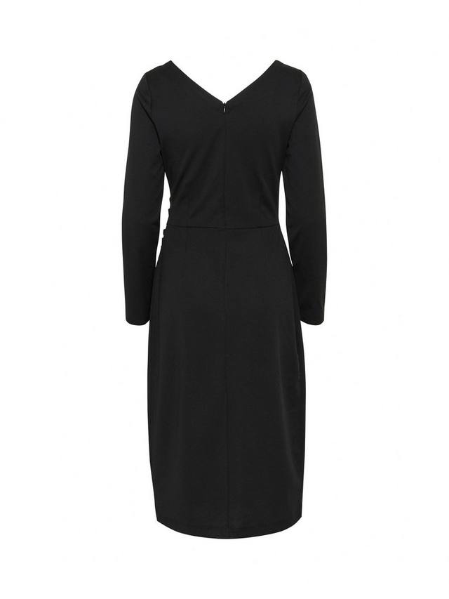 Элегантное и неподвластное времени коктейльное платье, которое можно надеть по любому поводу. Сшитое на заказ, оно имеет V-образный вырез спереди и сзади, рюши на бедрах и отложной разрез. Рукава длинные, приталенного покроя, а длина платья доходит до середины икры. Изготовлено с использованием переработанных материалов, что помогает нам уменьшить наше воздействие на планету.