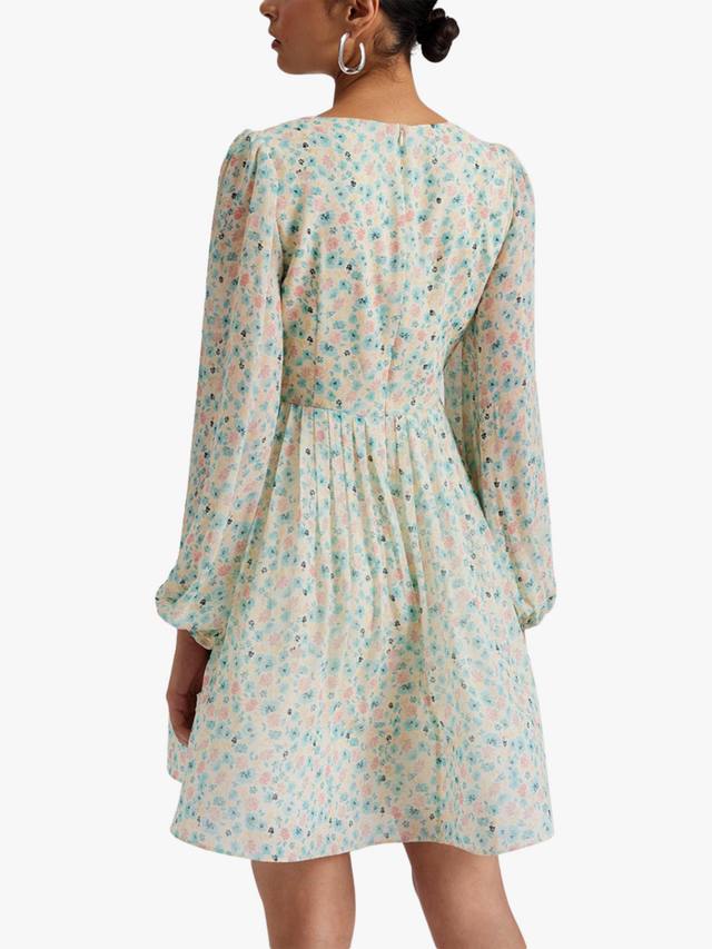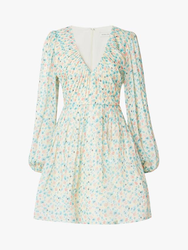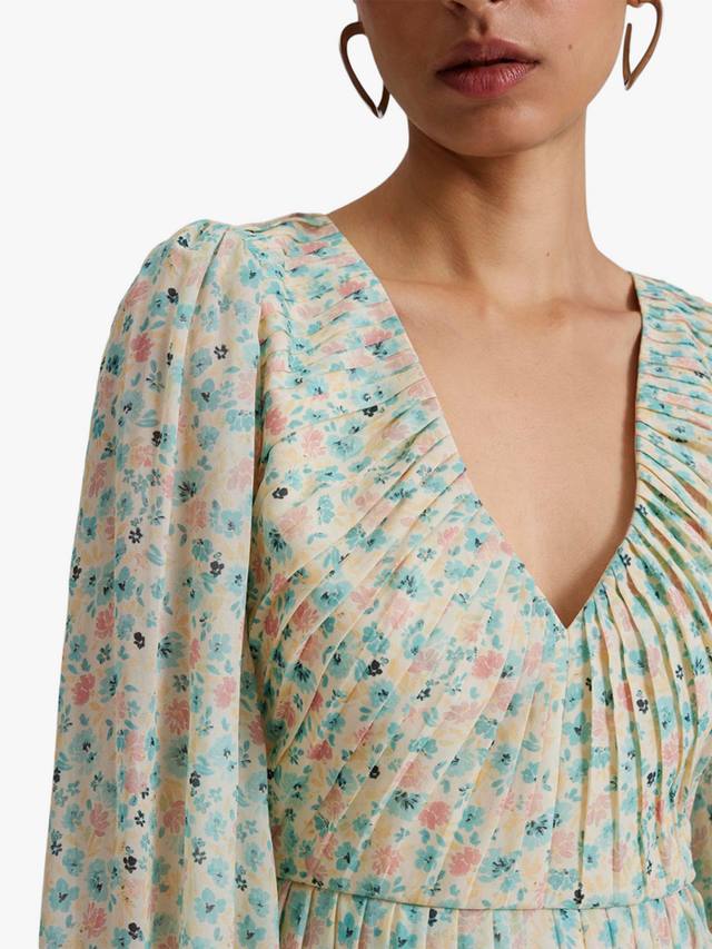 Шифоновое мини-платье с V-образным вырезом, причудливым цветочным узором, плиссированными деталями и приталенной талией. Создано для шикарных и элегантных случаев.