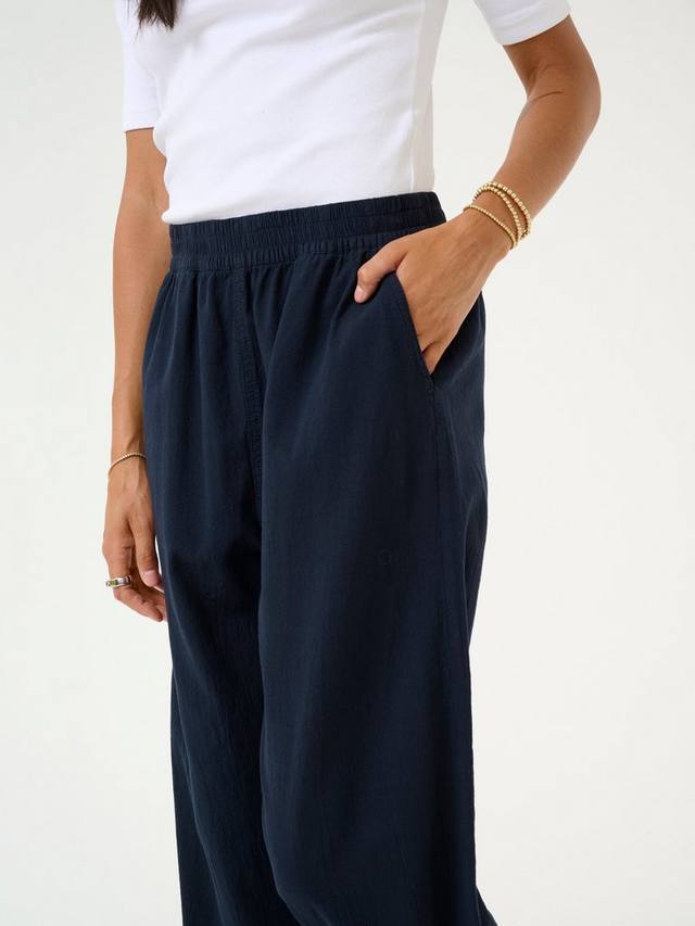 Брюки naya - это повседневные и удобные брюки на каждый день. Они изготовлены из 100% хлопка, что делает их мягкими и легкими в носке. У них широкие штанины и повседневная посадка. Брюки имеют эластичный пояс со сборками и потайные передние карманы.