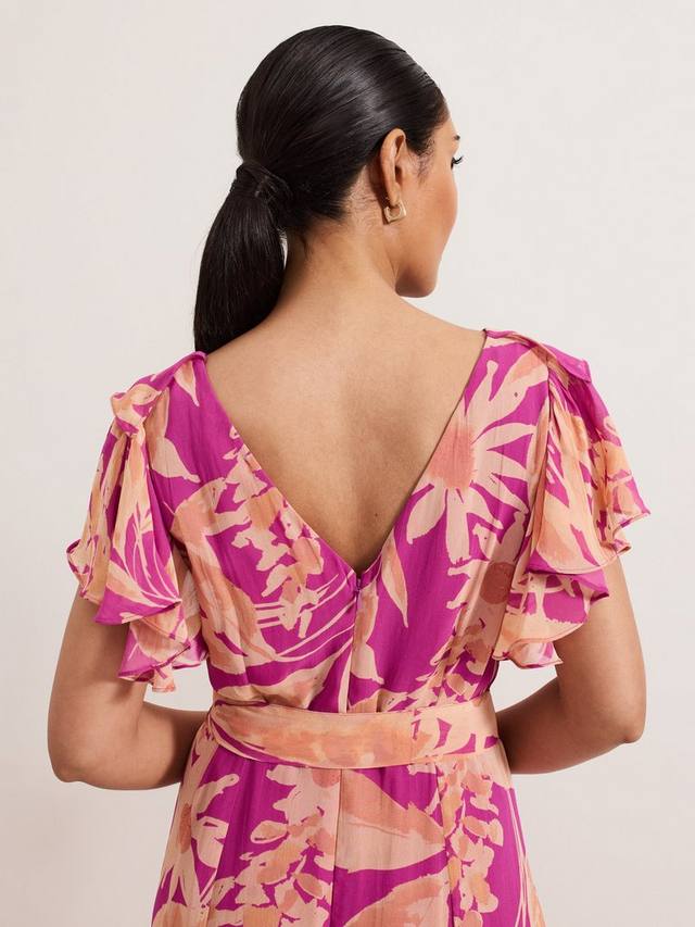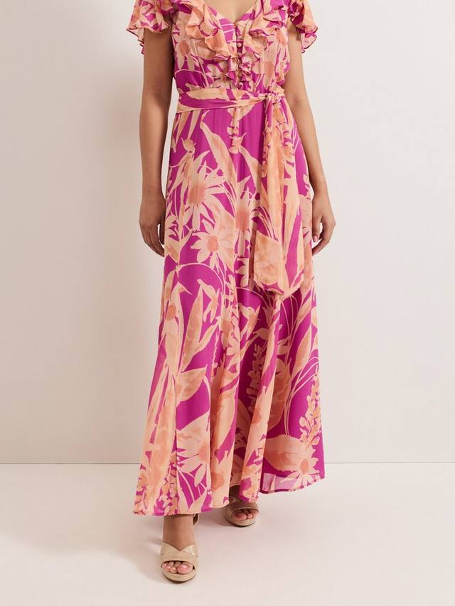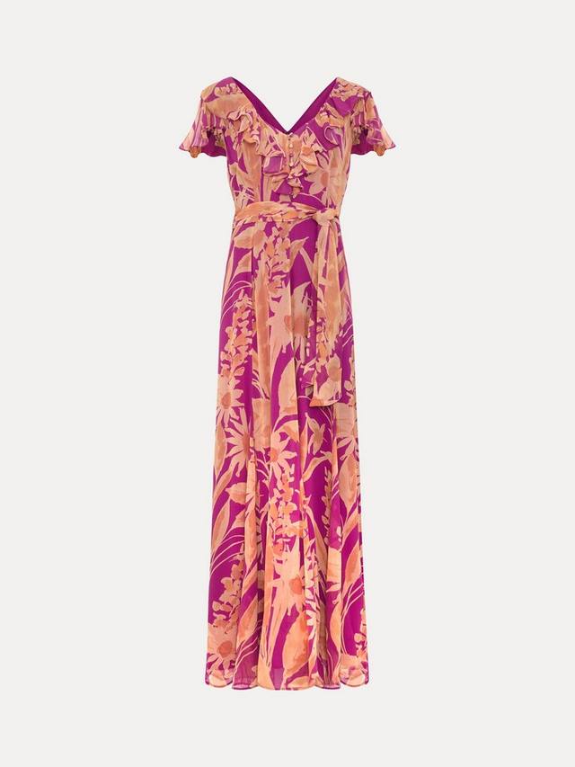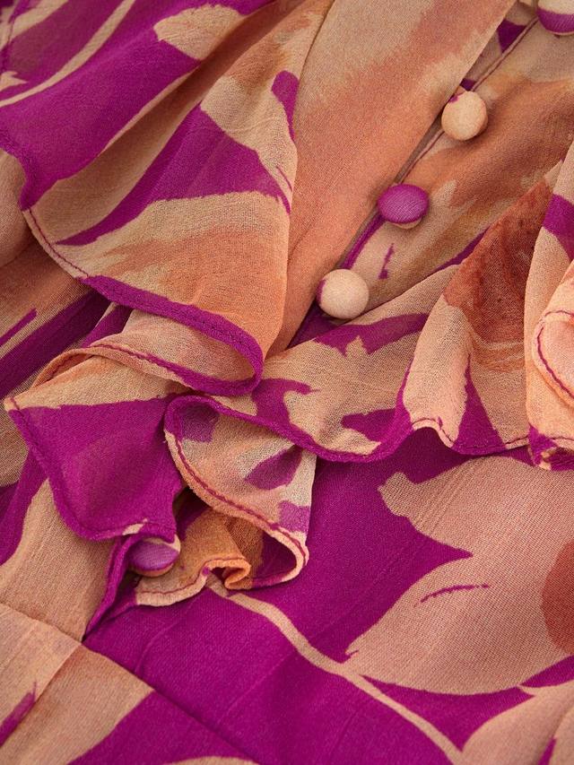 Платье Dinara яркого оттенка украшено эксклюзивным принтом ручной росписи, вдохновленным подсолнухами. Мягкие оборки на лифе и рукавах подчеркивают женственный V-образный вырез, а пуговицы в тон и пояс с завязками дополняют его замысловатыми деталями. Облегающий силуэт макси, ниспадающий каскадом по телу, станет идеальным вариантом для любого особого случая в вашем календаре.
