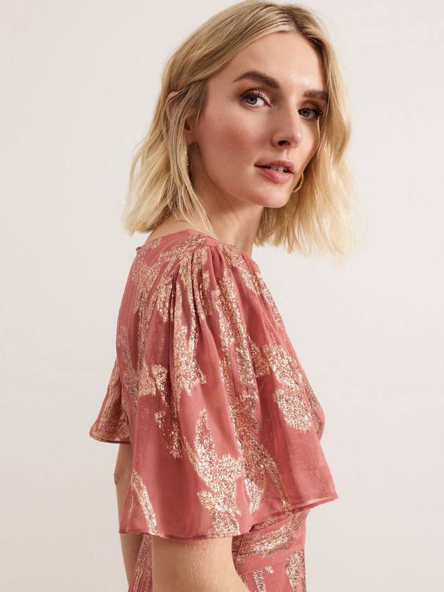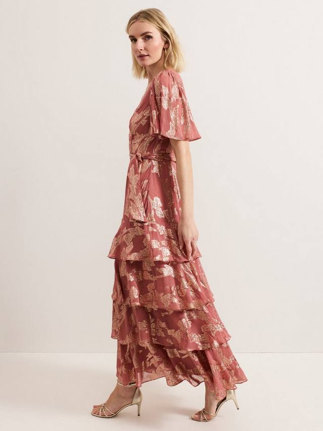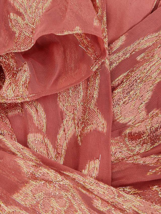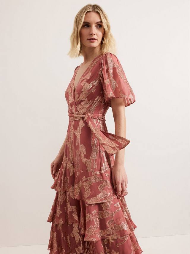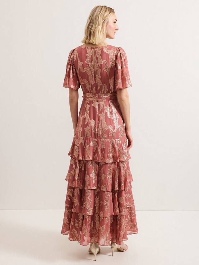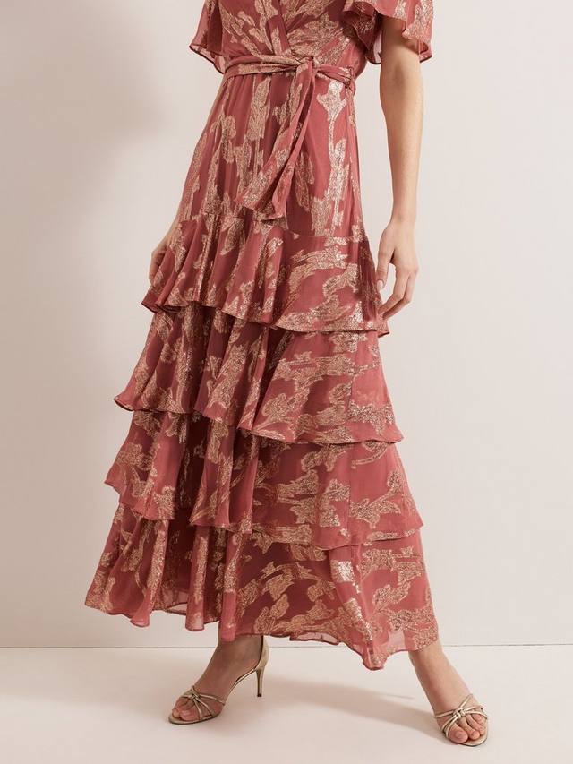 Платье Elaine с красивой основой украшено современным принтом в виде листьев с мерцающими нитями, которые переливаются при движении. Струящаяся юбка макси украшена многоярусными оборками, придающими фигуре красивую форму. Дополните образ подходящими золотыми аксессуарами для создания женственного образа для мероприятий, который вы будете носить сейчас и в последующие сезоны.