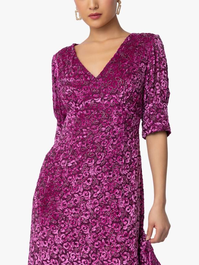 Эффектное платье миди Roxana со смелым рисунком и привлекательным V-образным вырезом. Облегающий лиф и рукава 3/4 подчеркивают талию, создавая элегантный силуэт.