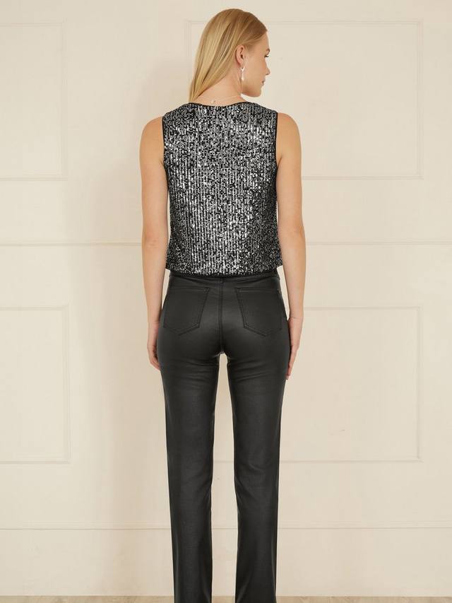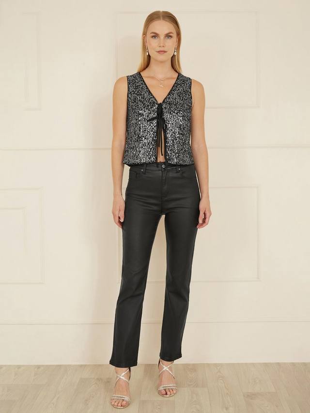 Украсьте новый сезон этим милым маленьким жилетом. Нам нравится, когда он украшен пайетками по всей длине и завязывается спереди, поэтому его можно сочетать с широкими брюками или джинсами. С небольшой растяжкой для повышения комфорта ношения.