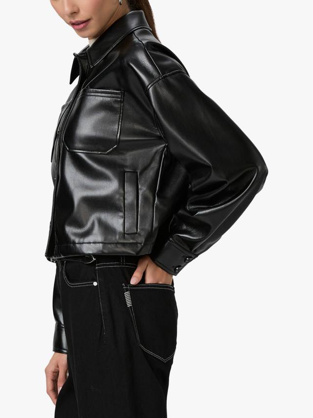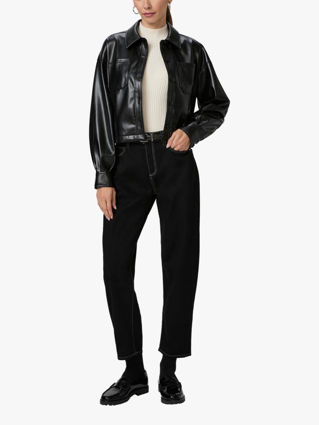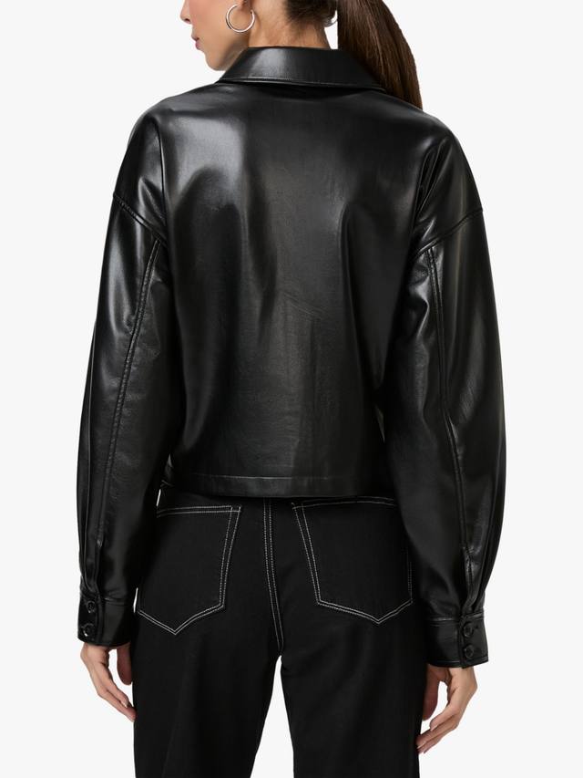 Модель Connor Shacket обновлена из мягкой эластичной искусственной кожи. Это многослойное изделие среднего веса, слегка укороченного кроя, с двойными накладными карманами спереди и заниженным плечом, создающим более непринужденную атмосферу.