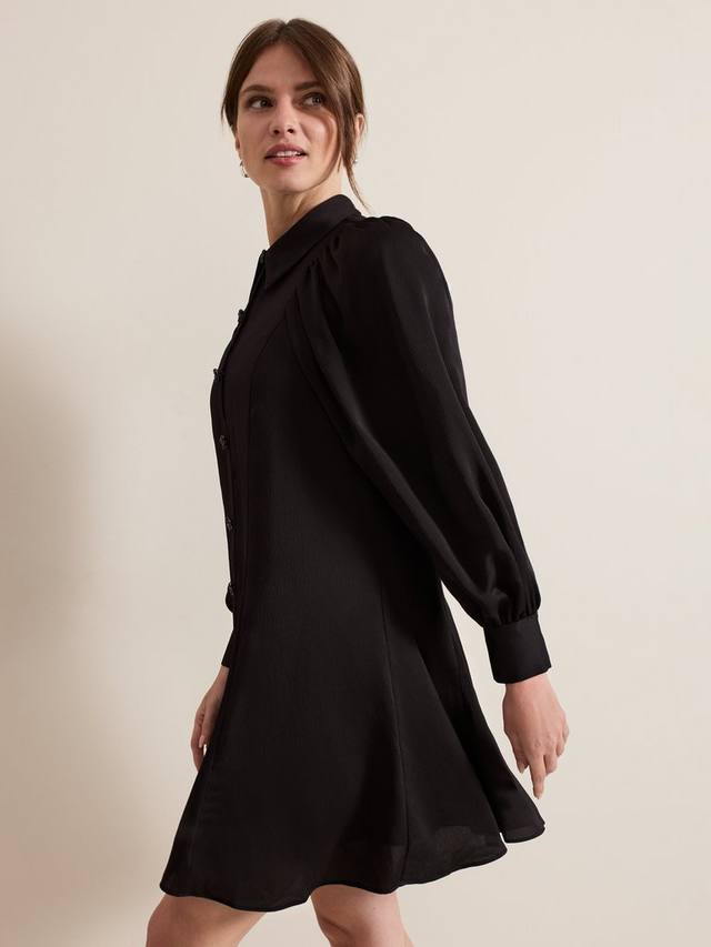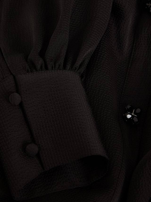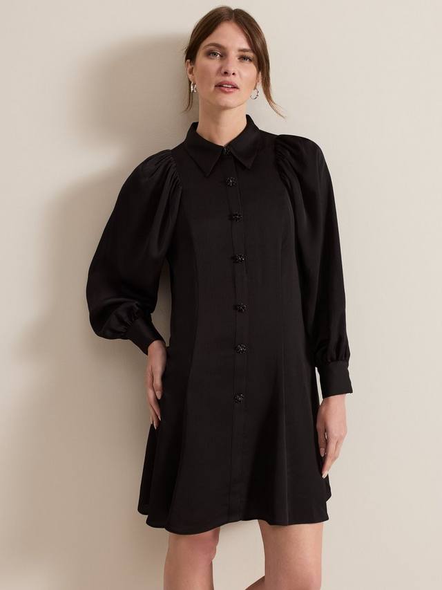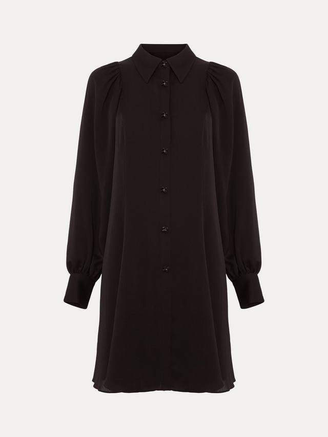 Платье Tila с длинными рукавами-блузонами и вырезом с отложным воротником. Текстурированный материал и пуговицы из черных драгоценных камней подчеркивают стиль, создавая классический мини-образ, который подойдет вам от работы до выходных.