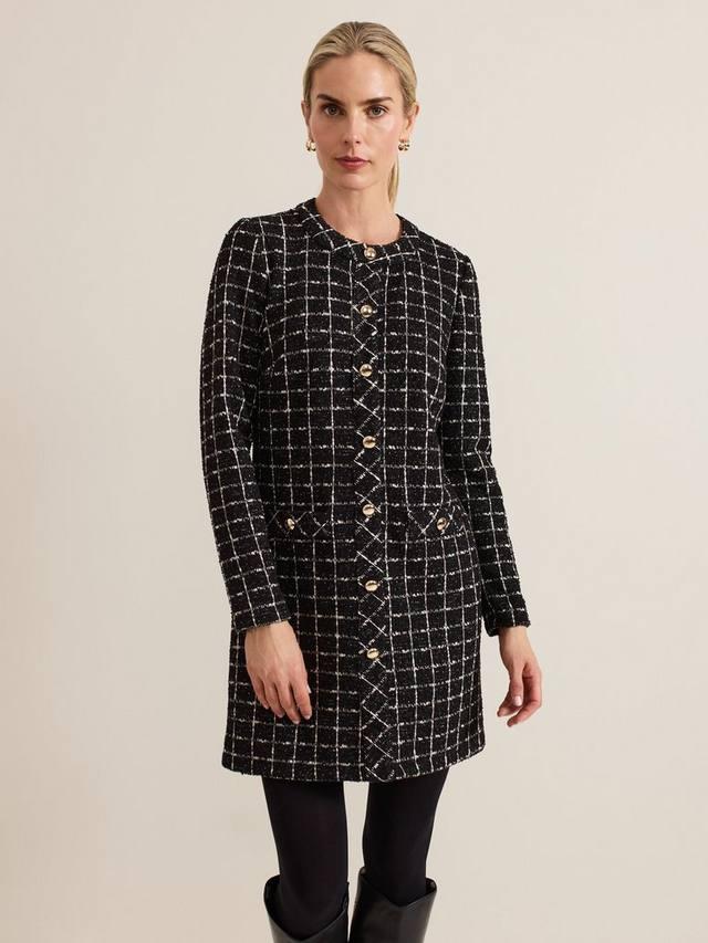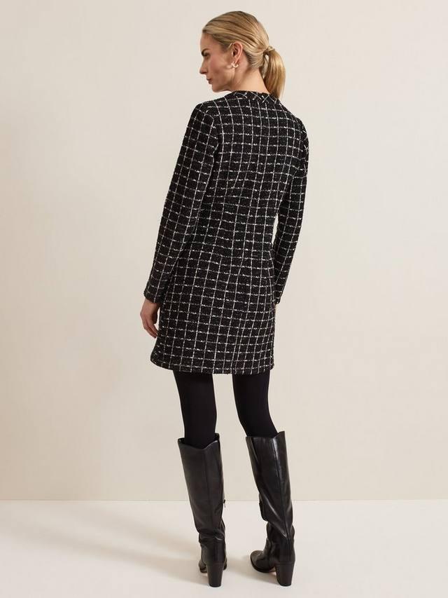 Платье Mylee от Phase Eight, выполненное из неподвластного времени твида, с круглым вырезом, длинными рукавами, золотыми пуговицами и длиной чуть выше колена. Мы сочетаем его с колготками и черными ботинками для создания утонченного образа.