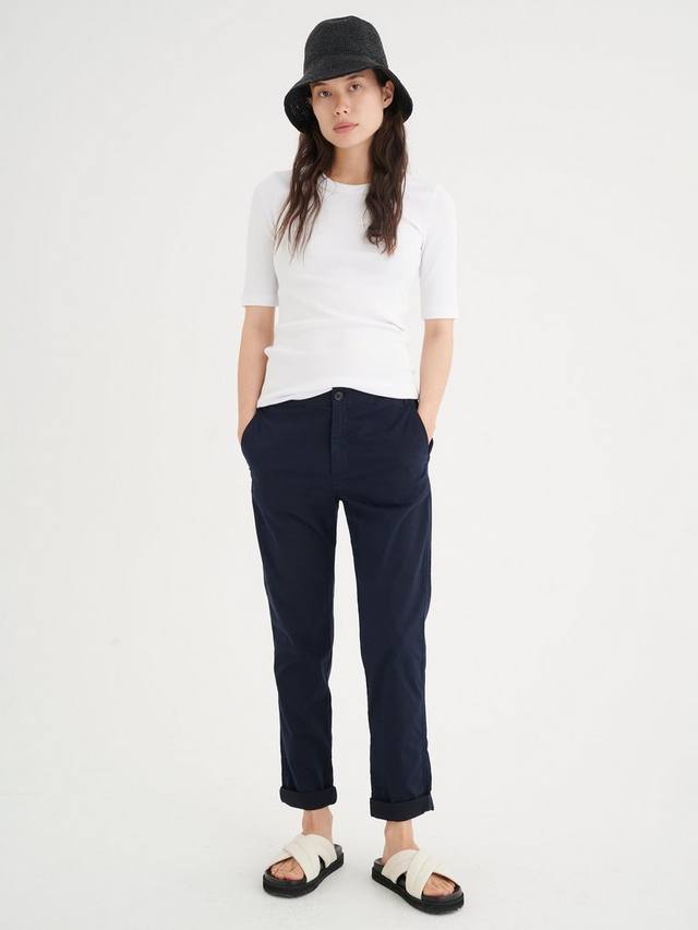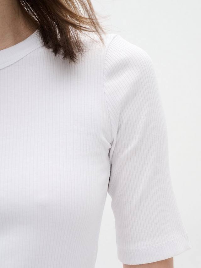 Футболка Dagnal - это простая футболка из мягкого трикотажа с множеством вариантов фасона. У нее круглый вырез и приталенный крой, она выполнена из хлопкового трикотажа в рубчик. Рукава обрезаны выше локтей, а футболка разрезана на бедрах.