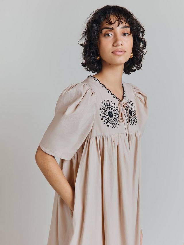 Мы воспользовались комфортом классического платья-халата и добавили продуманных деталей, чтобы создать Ramona, легкое платье свободного кроя из хлопкового поплина. Контрастная цветочная вышивка и вышитый зубчатый край на подоле и горловине идеально дополняют короткие рукава, а сборка на плече придает объем. Завязывается на шее самостоятельно.