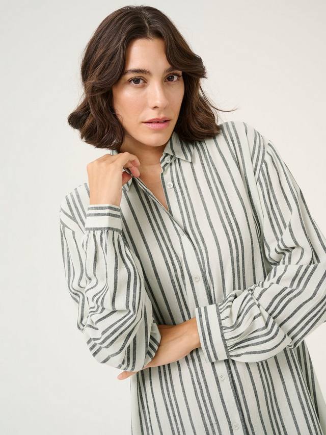Это платье-рубашка длиной до колен от KAFFE, являющееся таким же универсальным предметом гардероба, как и ваше светское расписание, выполнено из вискозы, придающей ему невесомость. Модель с воротником-стойкой и длинными рукавами украшена простыми полосками по всей ткани (потому что, давайте будем честными, от них слишком сложно отказаться).