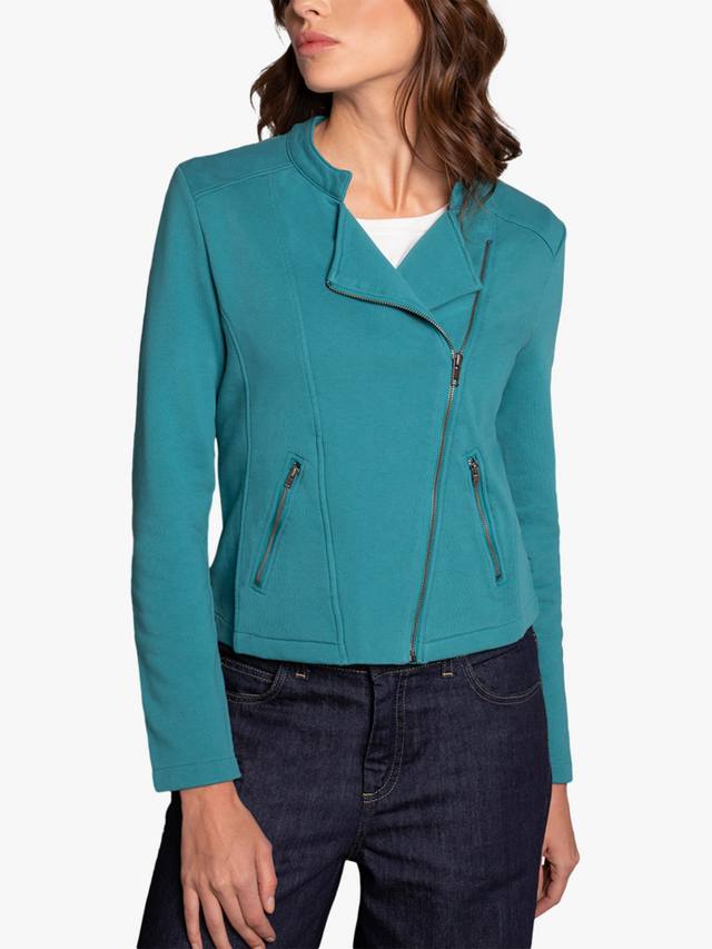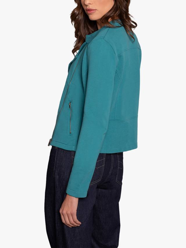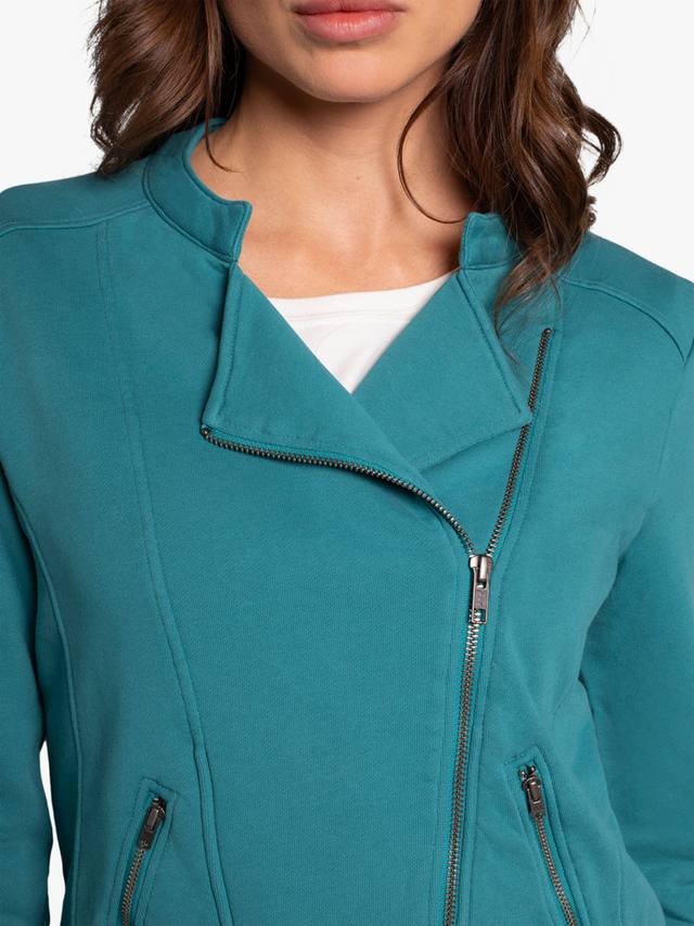 Аккуратная, но удобная укороченная куртка в байкерском стиле из 100% эластичного хлопка. Имеет асимметричную цельнометаллическую молнию спереди и карманы на молнии, а также короткий воротник-стойку. Без подкладки для повседневной носки.