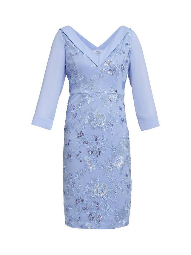 Подчеркивающее ваши формы платье силуэта карандаш от Gina Bacconi длиной до колен, сшитое из смеси ткани moss crepe. Непринужденный v-образный вырез и рукава длиной три четверти выгодно подчеркивают фигуру, украшенные красивой вышивкой.